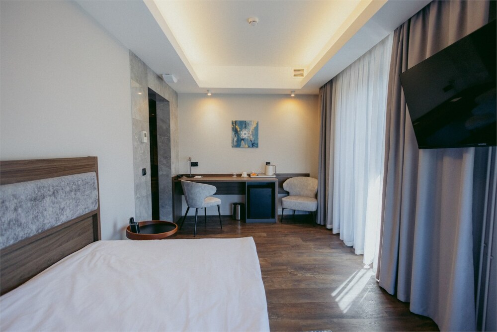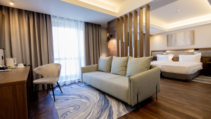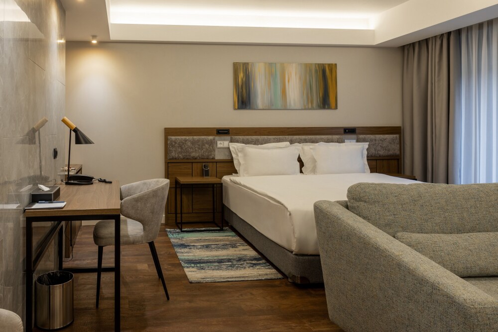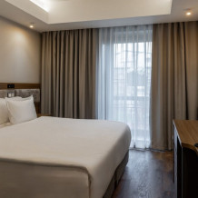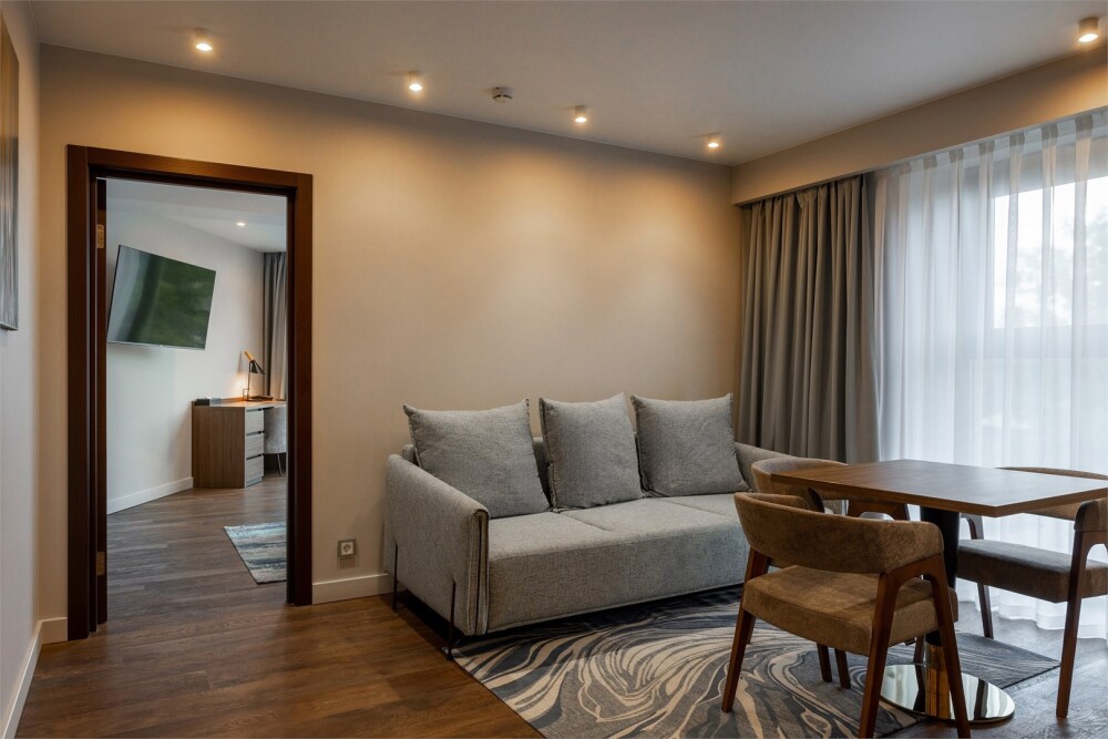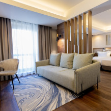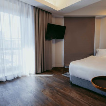 Номер включает в себя зону гостиной с раскладным диваном и спальни с кроватью King size. В номере с комфортом может разместиться семья или компания из трех человек. Интерьер в мягких, пастельных тонах создает изысканную, легкую атмосферу уюта и покоя, столь ценного в поездках. Начать день с чашки ароматного кофе или чая, расположившись за барной стойкой, или задернуть светонепроницаемые шторы и нежиться весь день в кровати – решать вам!