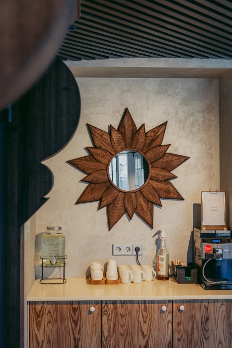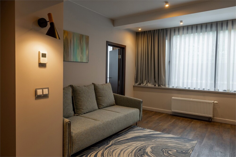 Пространство гармонично разделено на уютную спальную зону и гостиную с рабочим столом и раскладным диваном. Для удобства гостей кровати с ортопедическими матрасами трансформируются по запросу: одна большая King Size (180х200см) или две раздельные (90х200см).
