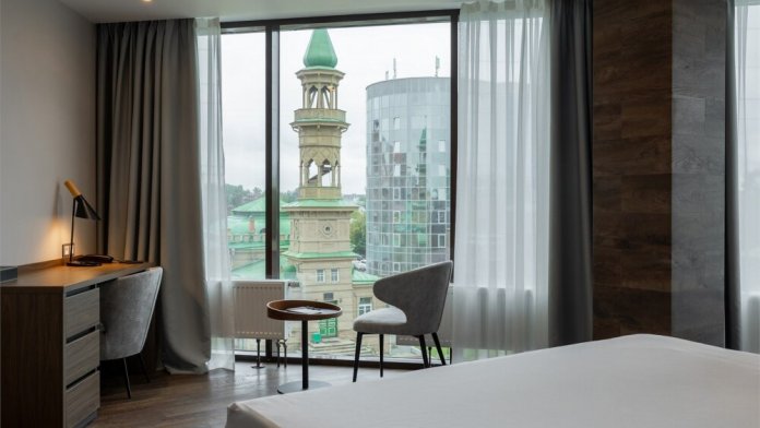 В номере: теплые полы. Апартаменты с панорамными окнами, кухней-гостиной и видом на историческую часть города.