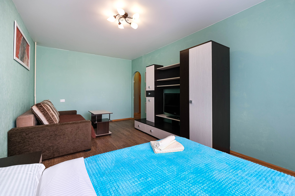 В квартире есть все необходимое для комфортного проживания: вся необходимая мебель, 2 двуспальных кровати, диван евро-книжка, стиральная машина. холодильник, микроволновка, плита, чайник, посуда для приготовления пищи. Утюг, фен, гладильная доска, сушилка для белья. TV, высокоскоростной безлимитный WI-FI. Средства гигиены.