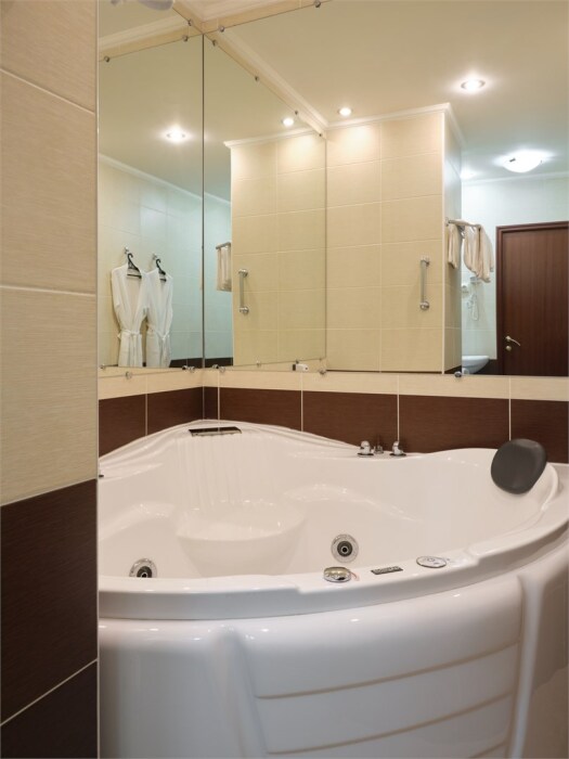 Оснащен мебелью из натурального дерева, двуспальная кровать, плательный шкаф, тумба, телевизор, мини-бар, кондиционер, персональный сейф. Ванная комната с душевой кабиной/джакузи.