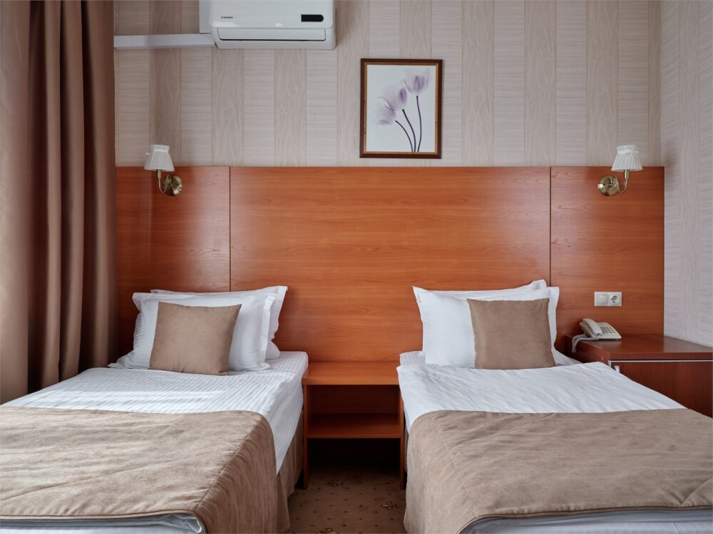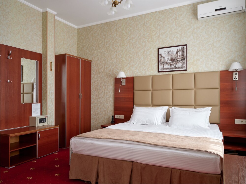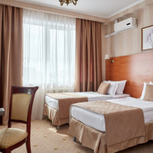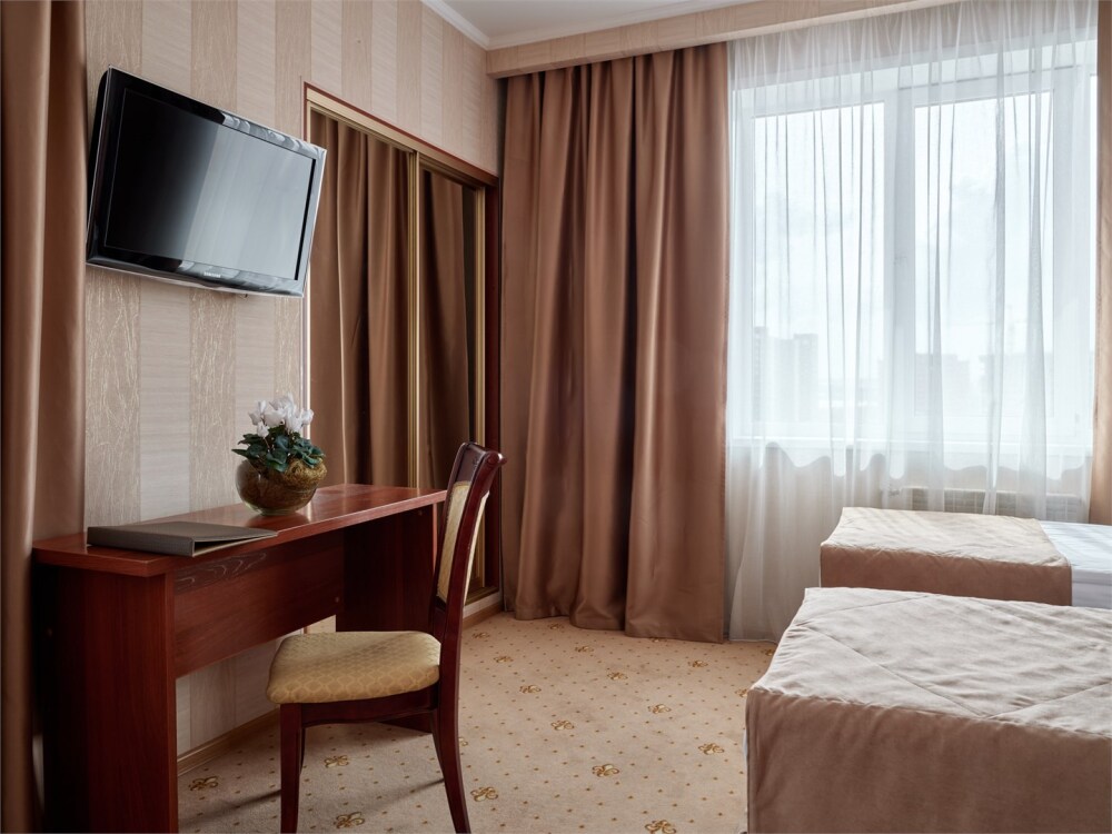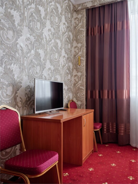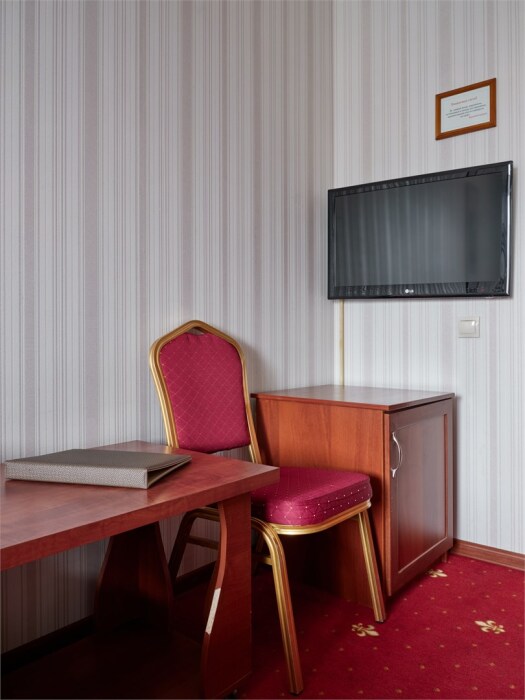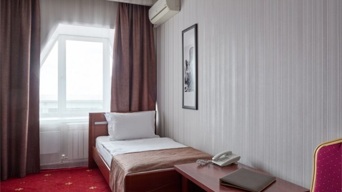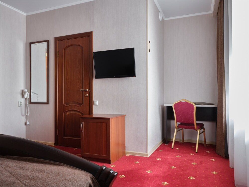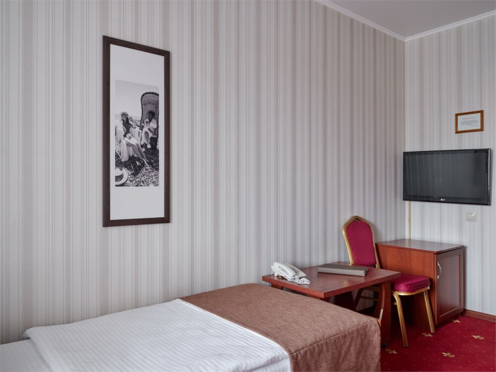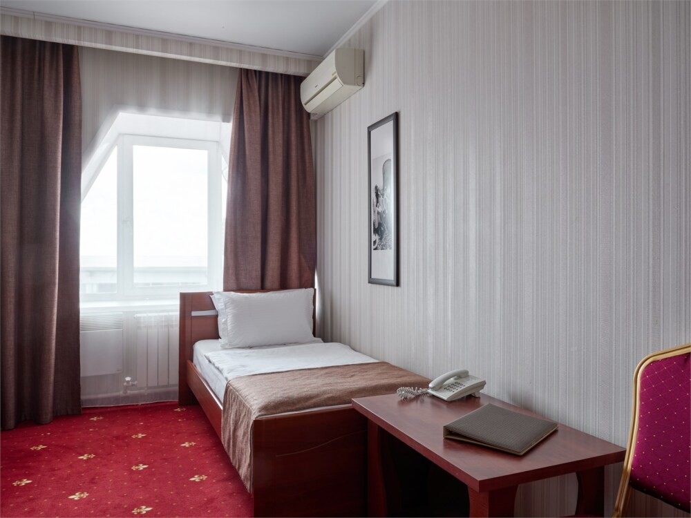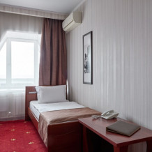 Оснащён необходимой мебелью (односпальная кровать, письменный стол, прикроватная тумбочка). В каждом номере ванная комната, оснащенная индивидуальным комплектом полотенец и средствами личной гигиены. Для Вашего удобства в номере есть бесплатный Wi-Fi, цифровое телевидение, кондиционер, мини-холодильник, телефон, фен.