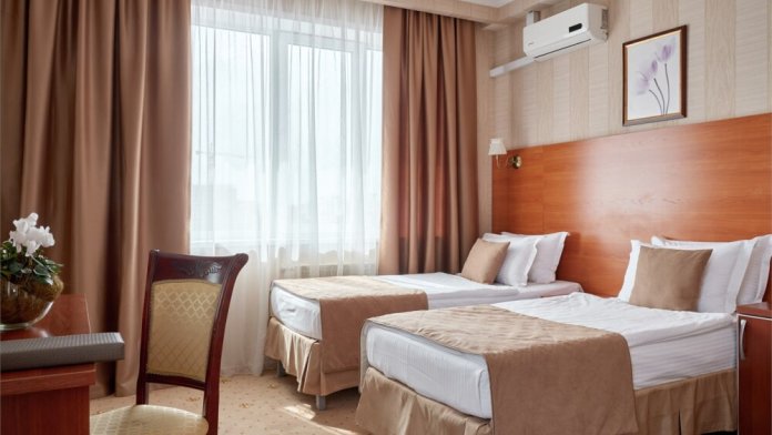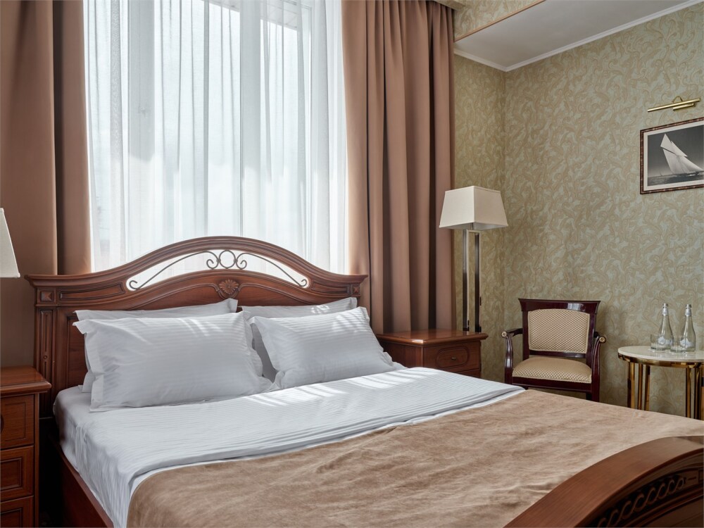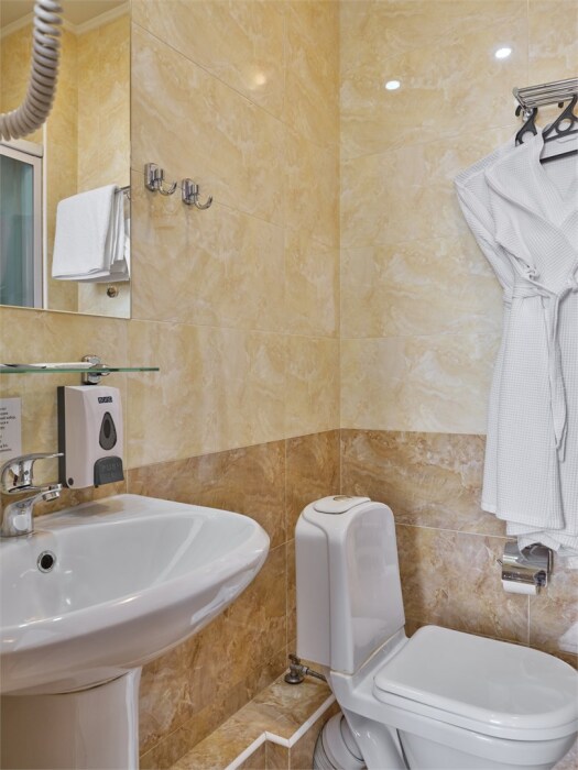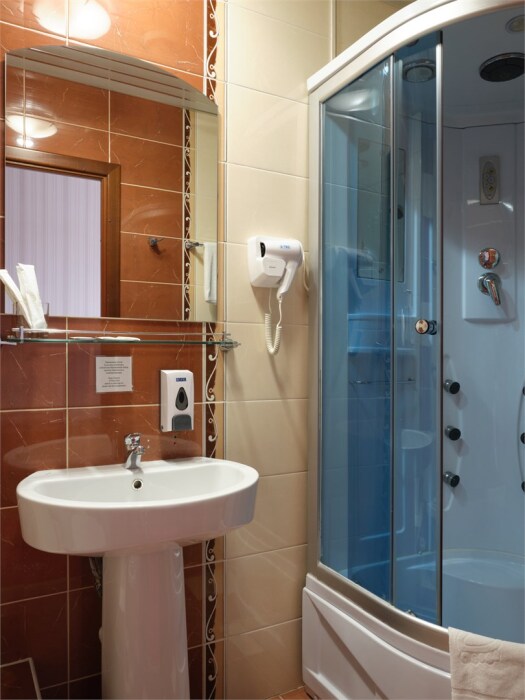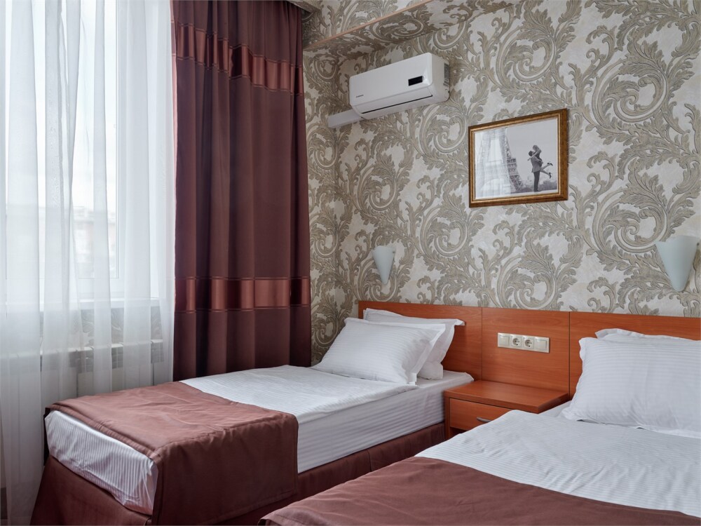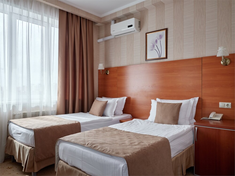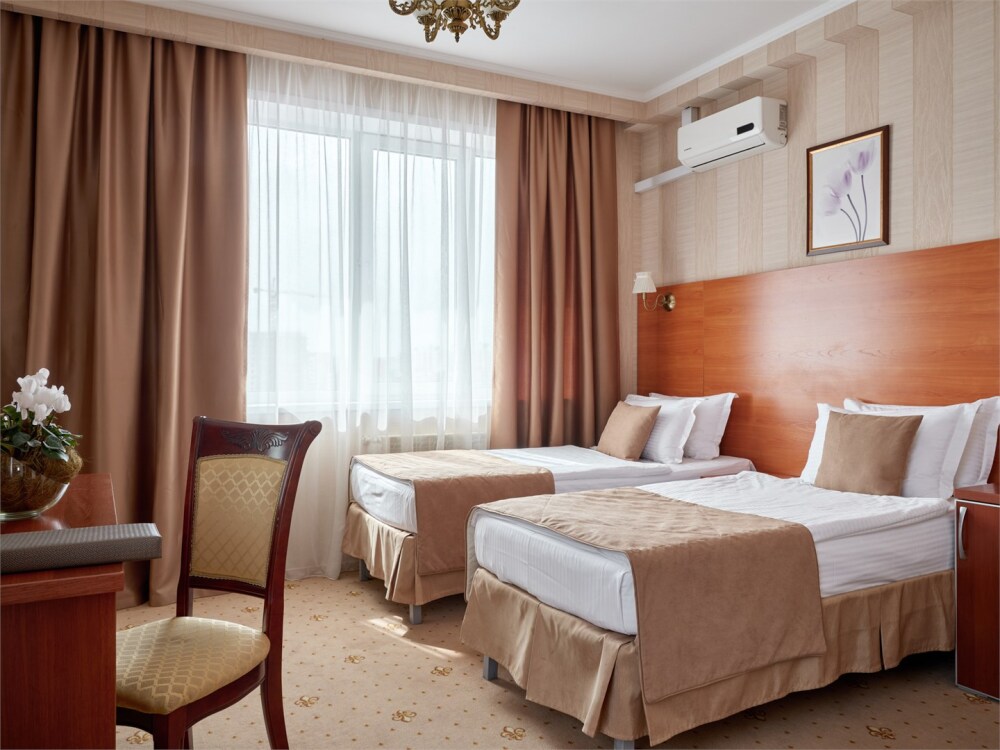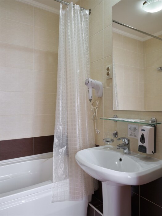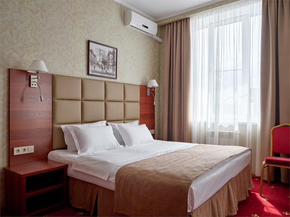 Оснащён необходимой мебелью (односпальная кровать, письменный стол, прикроватная тумбочка). В каждом номере ванная комната, оснащенная индивидуальным комплектом полотенец и средствами личной гигиены. Для Вашего удобства в номере есть бесплатный Wi-Fi, цифровое телевидение, кондиционер, мини-холодильник, телефон, фен.