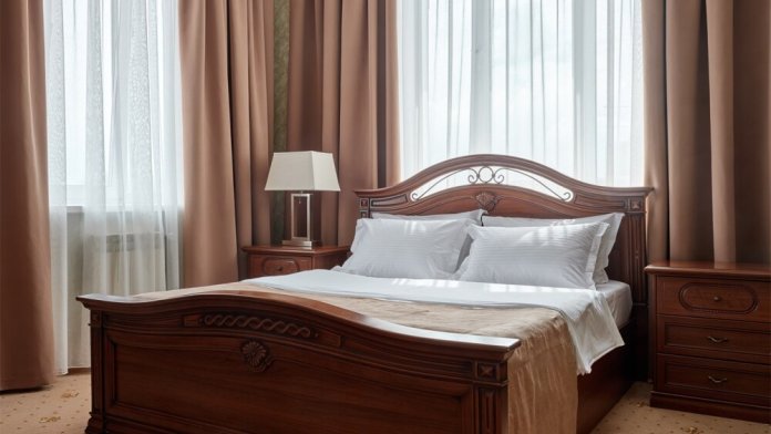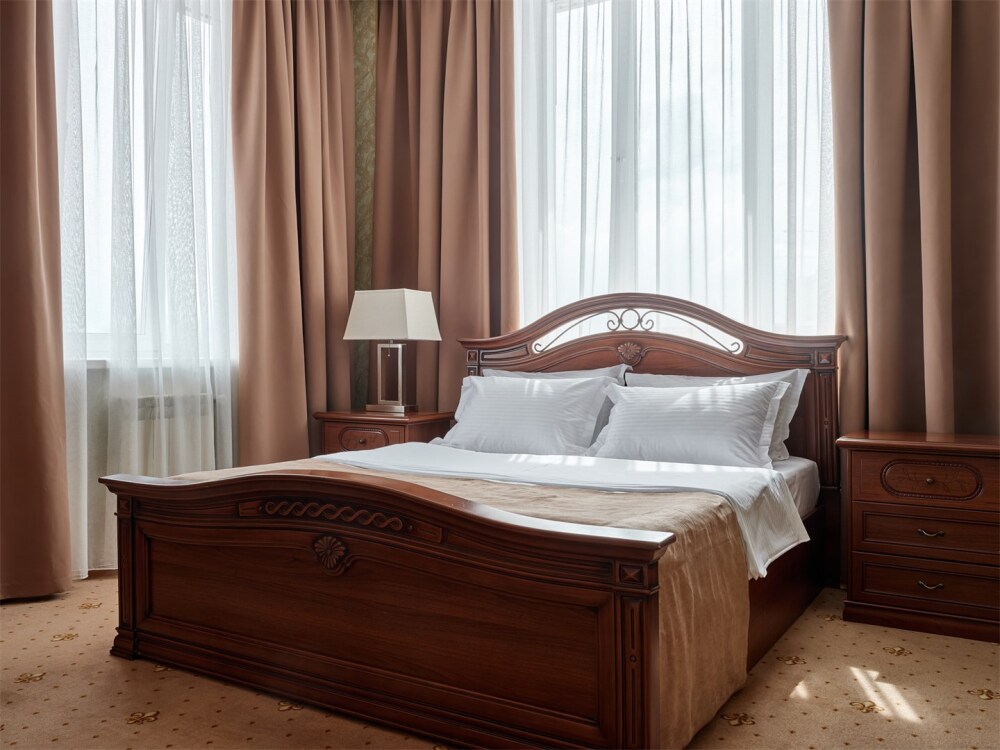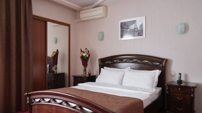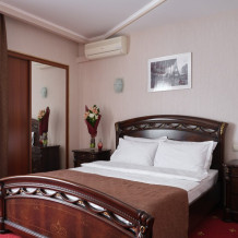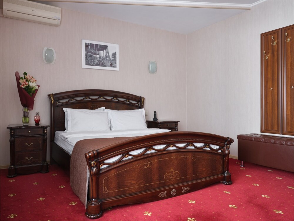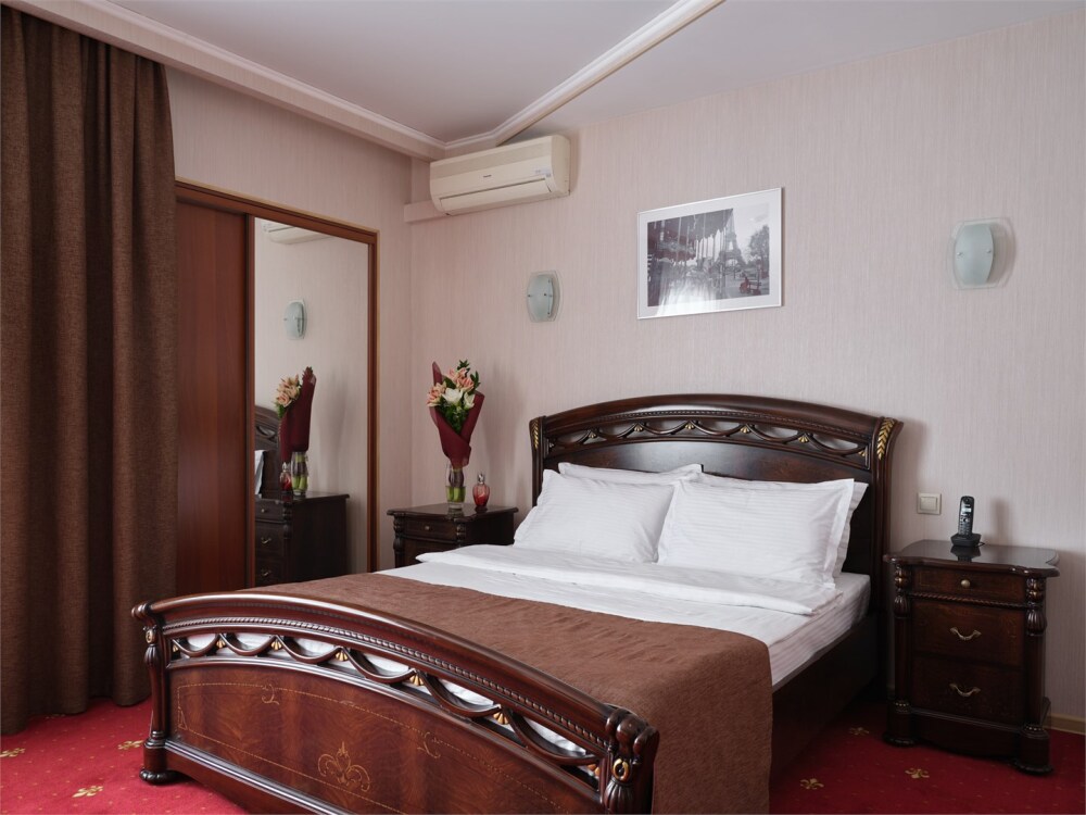 Оснащен мебелью из натурального дерева (двуспальная кровать, плательный шкаф, тумбочка, журнальный столик, компьютерный столик) жк-телевизор, мини-бар, кондиционер. Ванная комната с джакузи или с большой ванной.