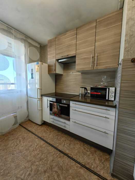 - На кухне Вы найдете плиту с духовым шкафом, микроволновку, холодильник и всю необходимую посуду.