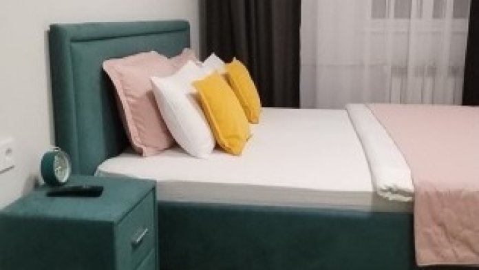Кровать с матрасом «Аскона» двуспальная, светонепроницаемые шторы, диван-кровать односпальная. Квартира оснащена всем необходимым для комфортного проживания: современное кухонное оборудование, набор посуды и столовых приборов.