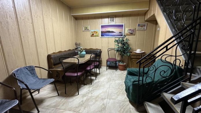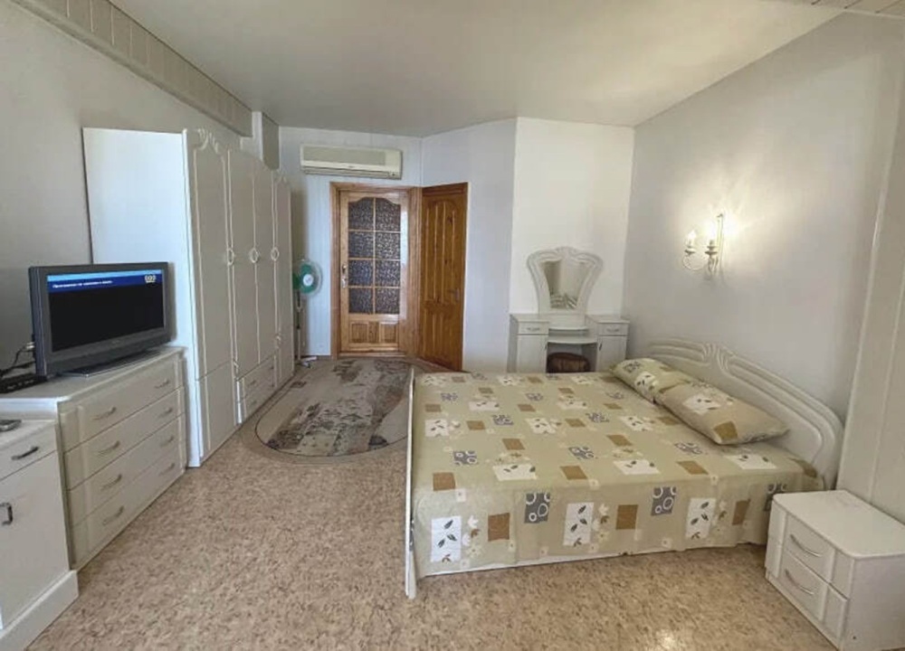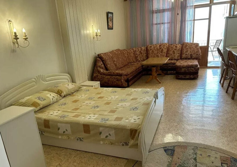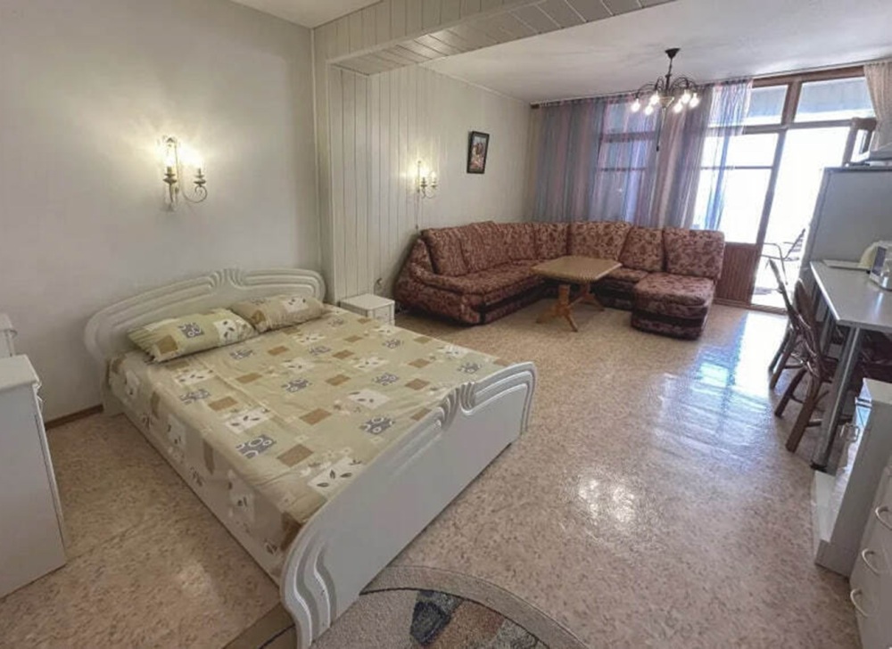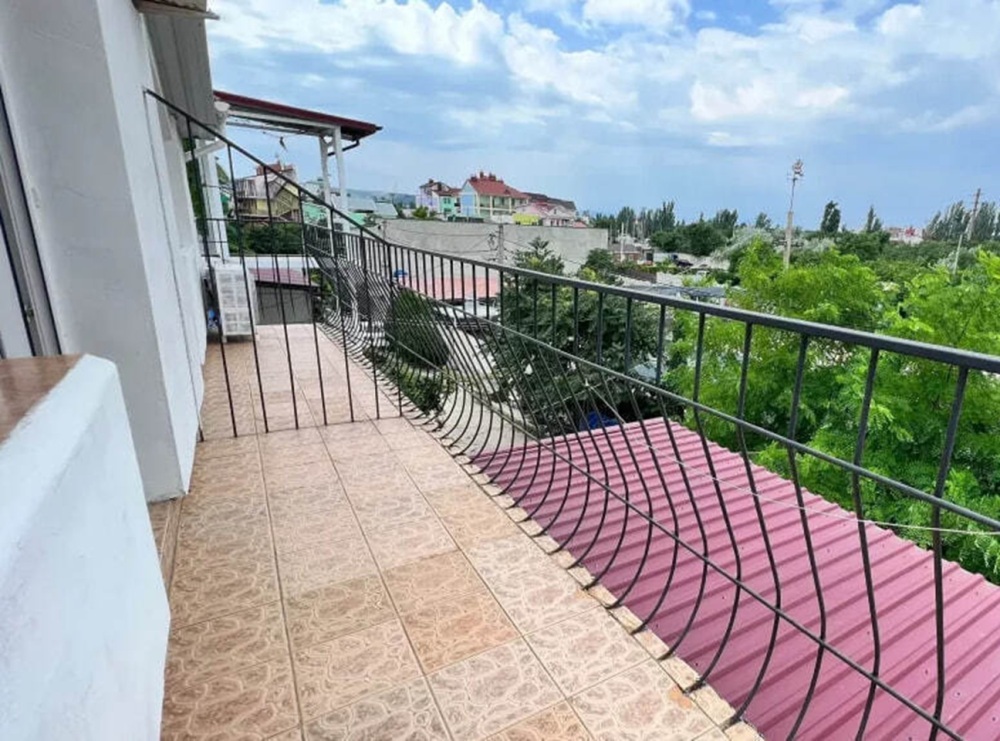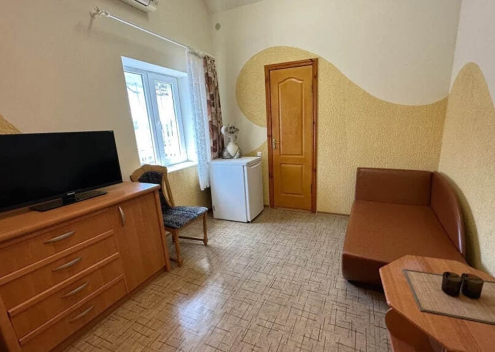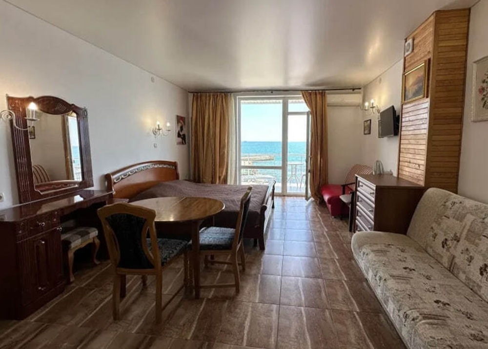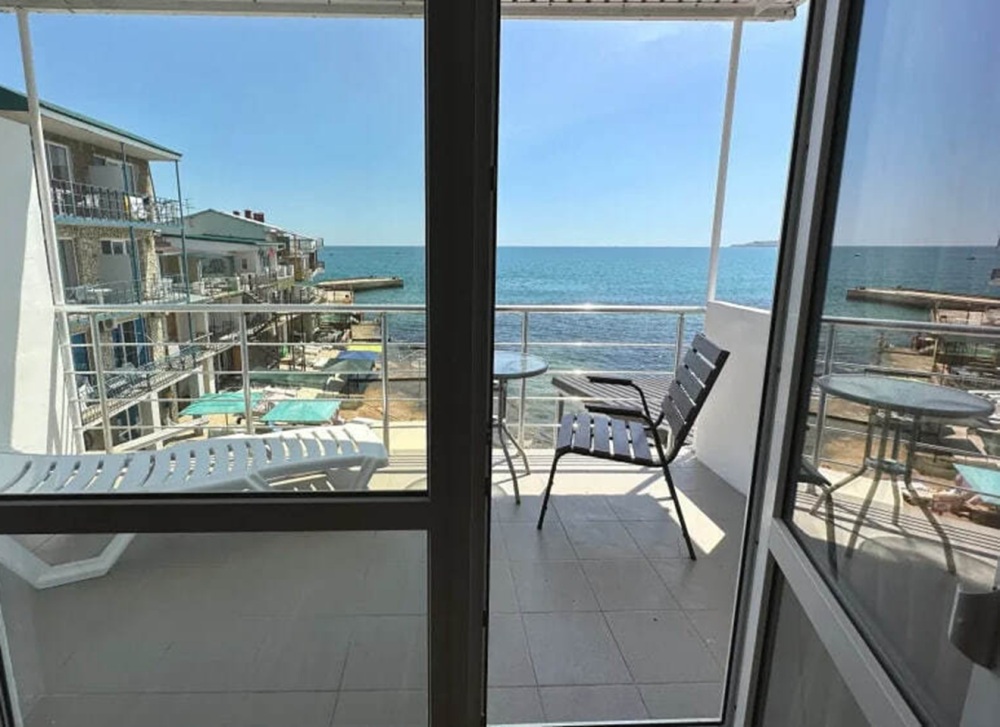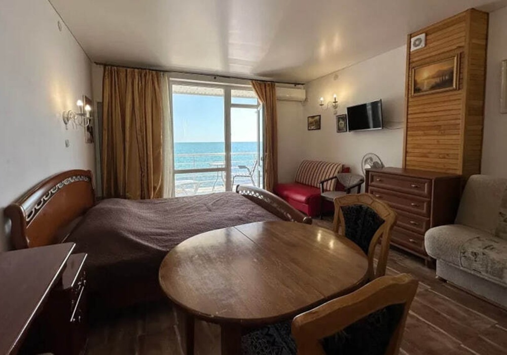 Номер расположен на 2-м этаже. Номер с большим балконом и видом на море. Отдельный вход со стороны моря (винтовая лестница). В номере кровать (спальное место 160 см), угловой раскладной диван. Также в номере есть: кухня, с необходимой посудой эл. плитой и эл. чайником, телевизор, кондиционер, холодильник, санузел (душ,туалет), горячая и холодная воды круглосуточно. Номер предназначен для 2 человек, с возможностью размещения 1 человека на дополнительном месте.