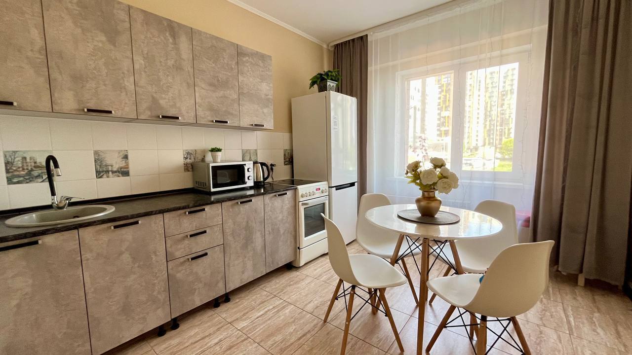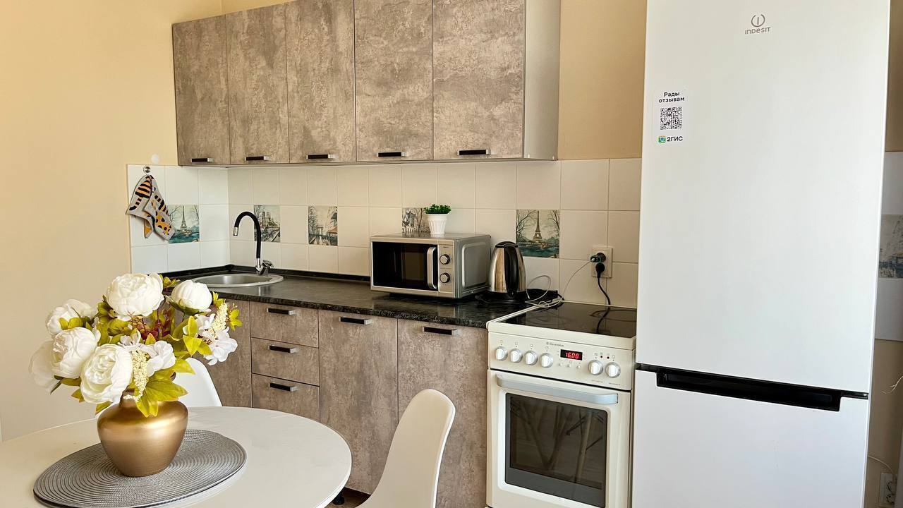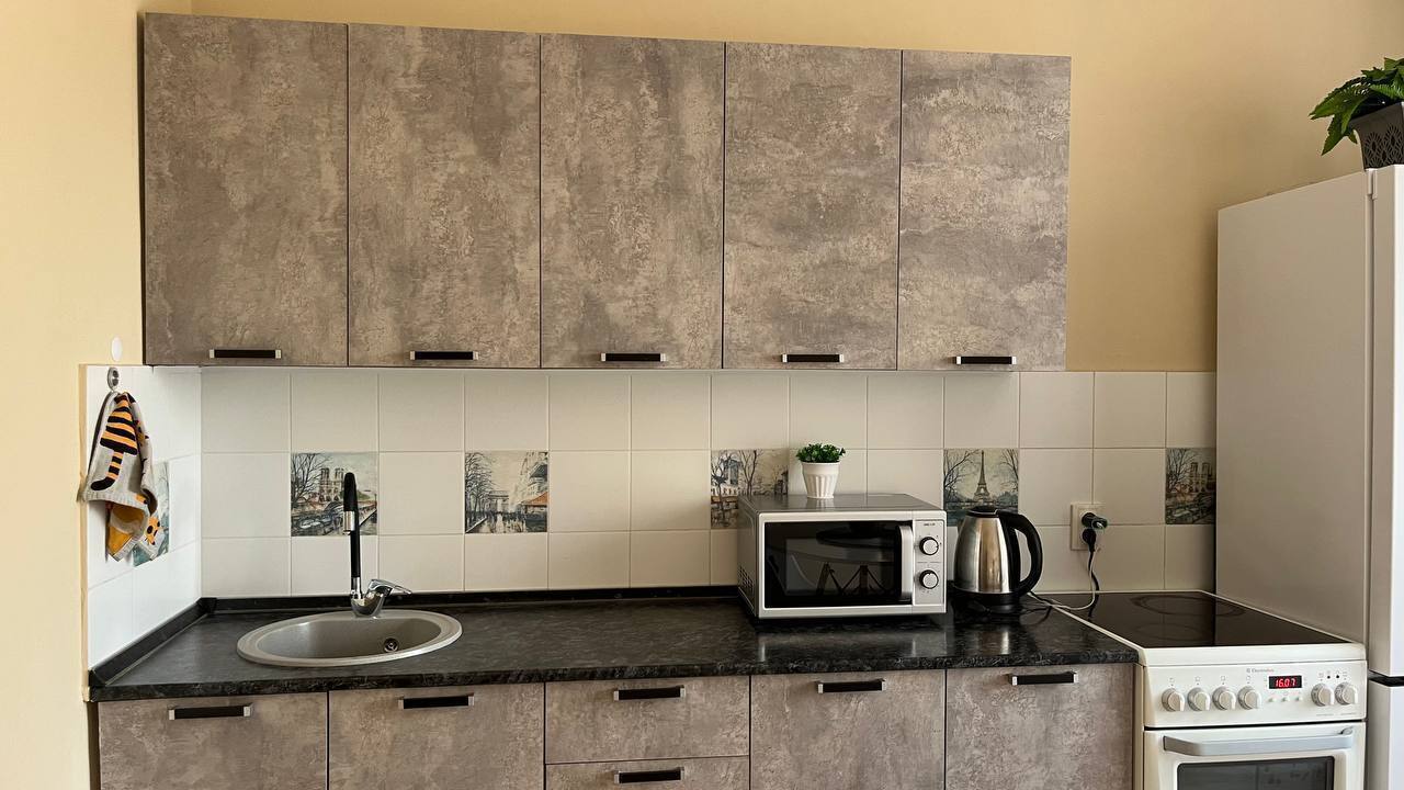 – На кухне у нас также есть все необходимое, включая плиту, духовой шкаф, холодильник, микроволновую печь, чайник и полный набор посуды.