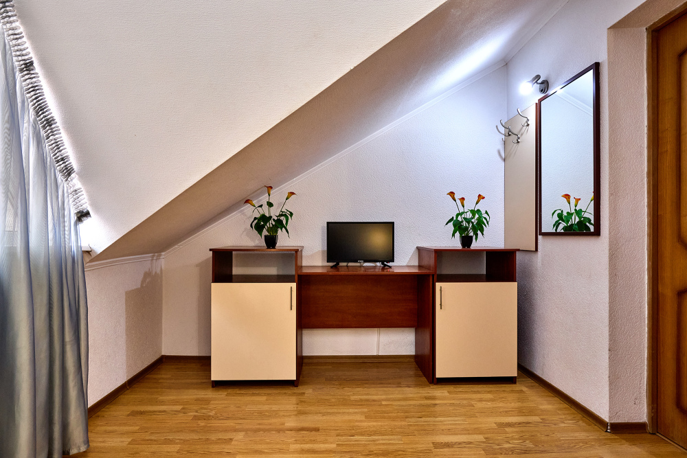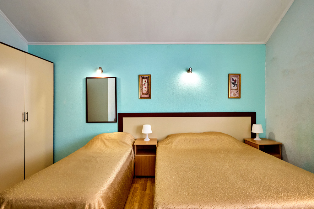 3-местный номер Эконом-класса без балкона с 1 двуспальной кроватью и одной односпальной, либо 3 односпальные кровати. В номере: сплит-система, холодильник, ТВ на 20 каналов, прикроватные тумбы и светильники, шкаф для одежды, полотенца, туалетные принадлежности, фен, электрочайник, набор посуды. Санузел и душевая кабина на этаже.