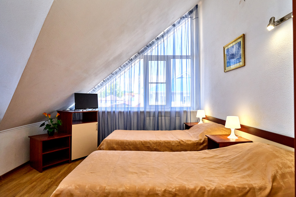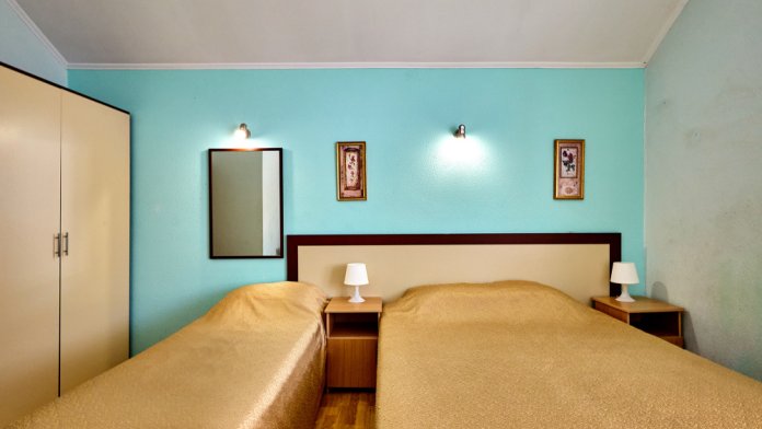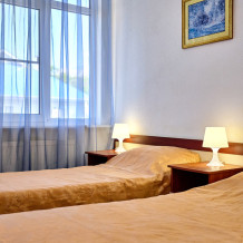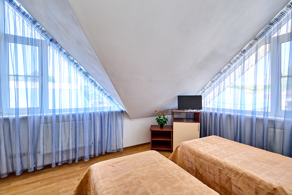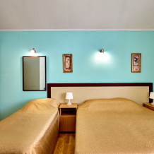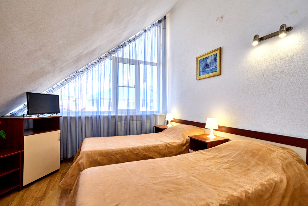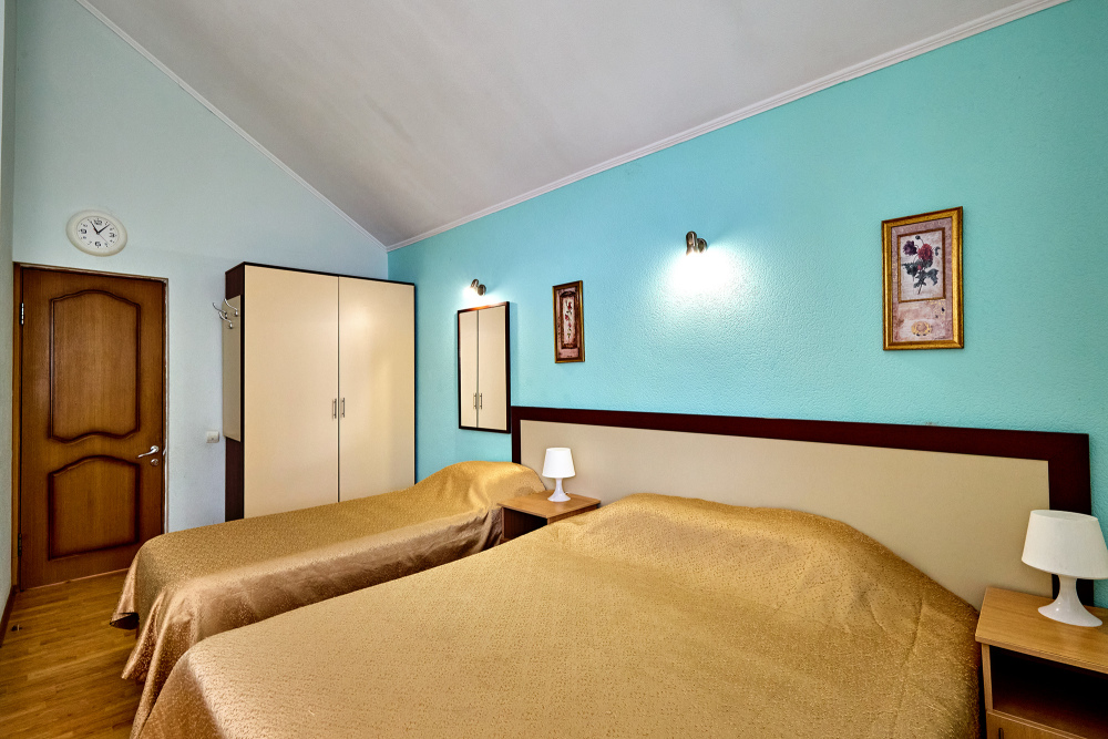 Стандартный 3-местный номер без балкона с 1 двуспальной кроватью и 1 односпальной кроватью, либо 3 раздельные односпальные кровати. В номере: сплит-система, холодильник, ТВ на 20 каналов, прикроватные тумбы и светильники, шкаф для одежды, полотенца, туалетные принадлежности, фен, электрочайник, набор посуды, санузел и душ в номере.