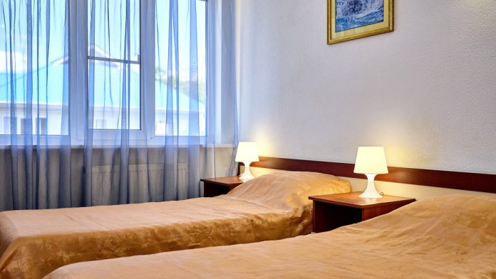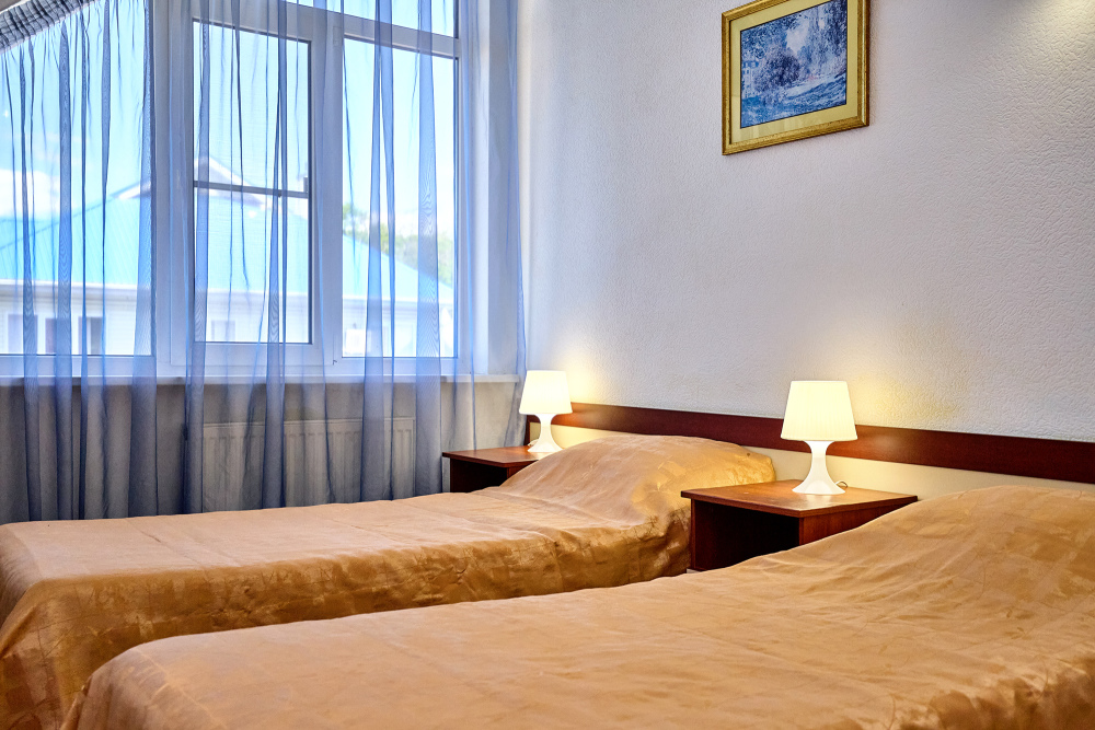 Стандартный 2-местный номер без балкона с 1 двуспальной кроватью или 2 отдельными кроватями. В номере: сплит-система, холодильник, ТВ на 20 каналов, прикроватные тумбы и светильники, шкаф для одежды, полотенца, туалетные принадлежности, фен, электрочайник, набор посуды, санузел и душ в номере.