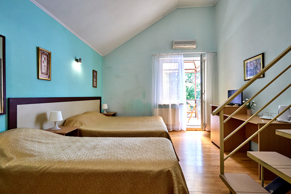 Стандартный 5-местный номер без балкона с 1 двуспальной кроватью и 3 односпальные кровати, либо 3 односпальные кровати и двуспальный диван .В номере: сплит-система, холодильник, ТВ на 20 каналов, прикроватные тумбы и светильники, шкаф для одежды, полотенца, туалетные принадлежности, фен, электрочайник, набор посуды, санузел и душ в номере.