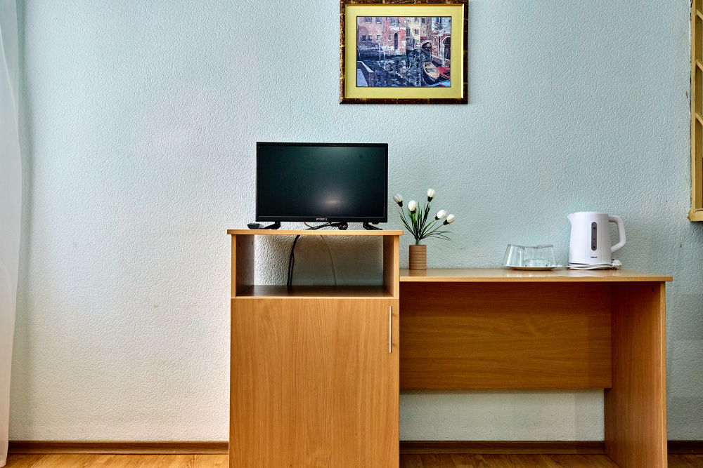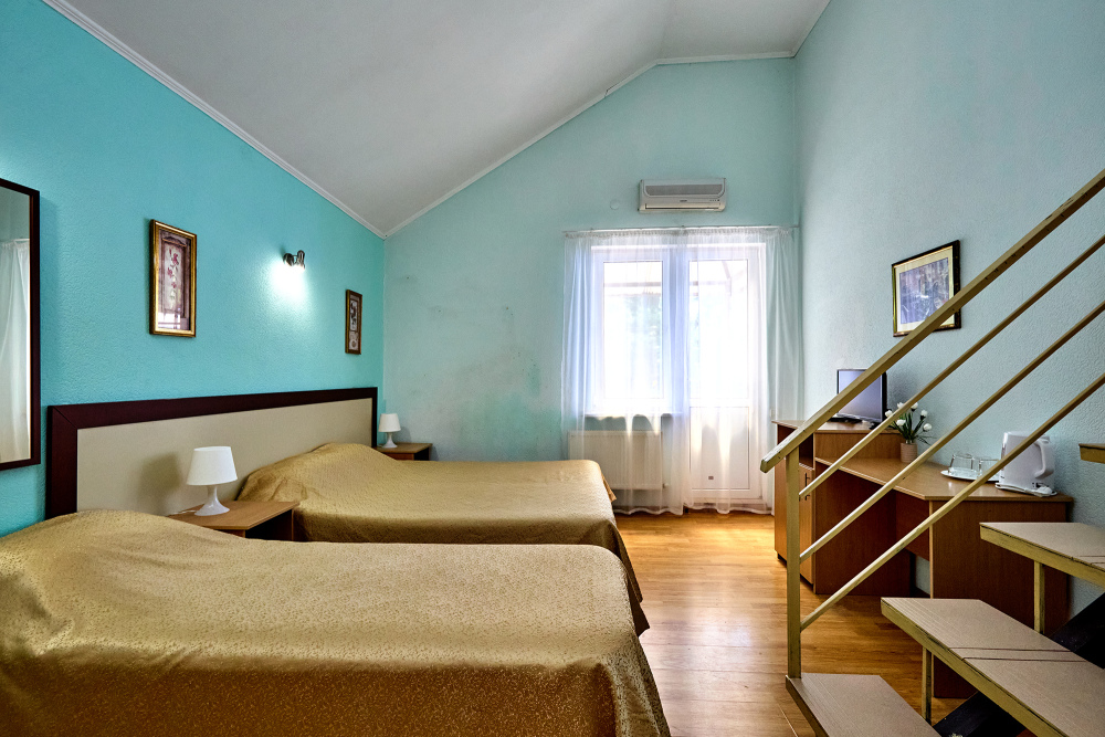 2-местный номер Эконом-класса без балкона с 1 двуспальной кроватью или 2 отдельными кроватями. В номере: сплит-система, холодильник, ТВ на 20 каналов, прикроватные тумбы и светильники, шкаф для одежды, полотенца, туалетные принадлежности, фен, электрочайник, набор посуды. Санузел и душевая кабина на этаже.