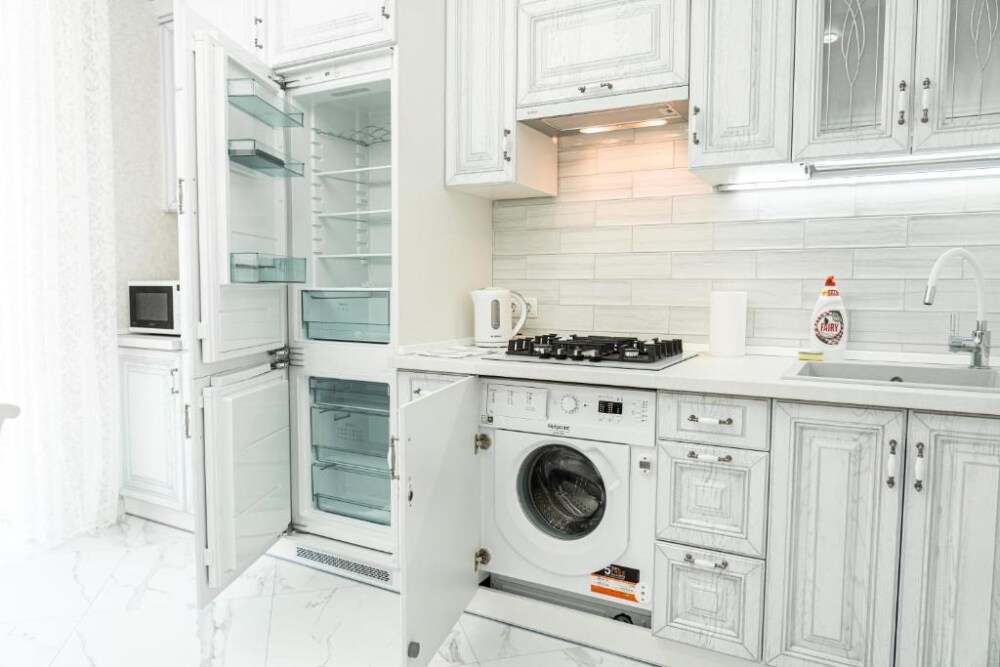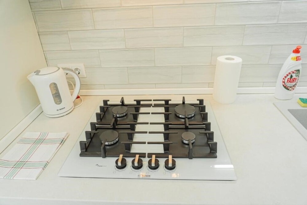 стиральная машина, полностью оборудованная кухня, собственная ванная комната с бесплатными туалетно-косметическими принадлежностями, телевизор с плоским экраном и бесплатный Wi-Fi, а также чайник, утюг, гладильная доска, фен;