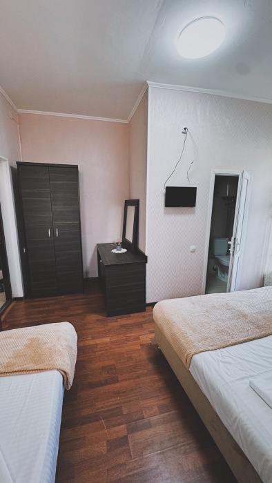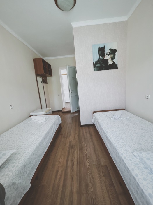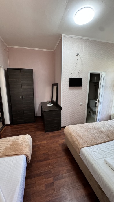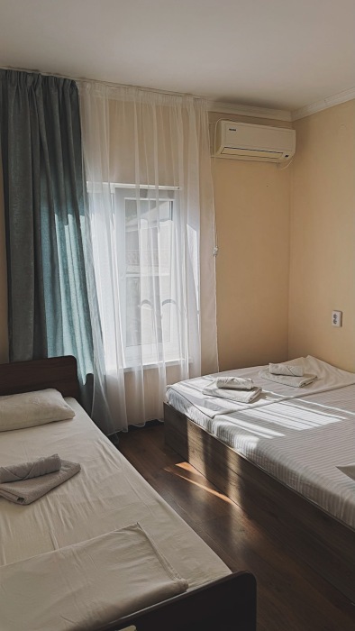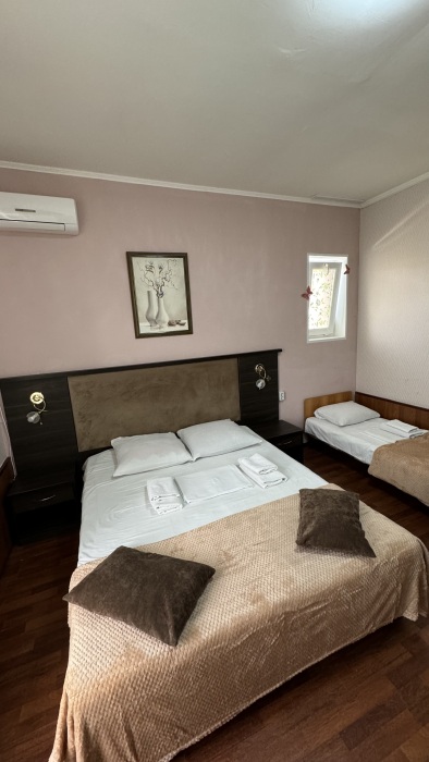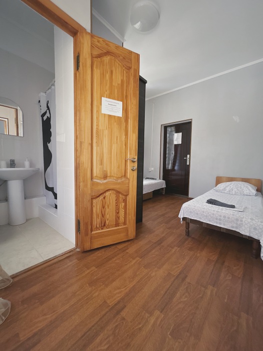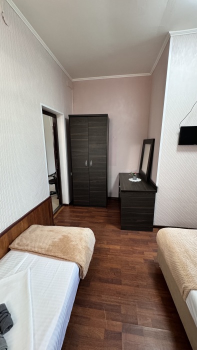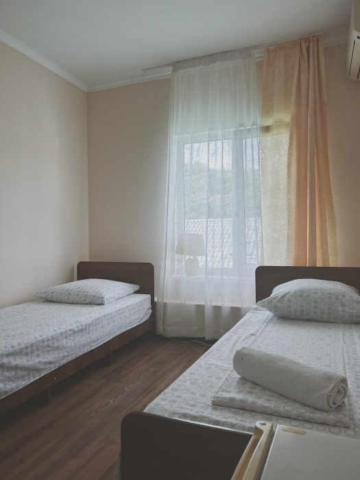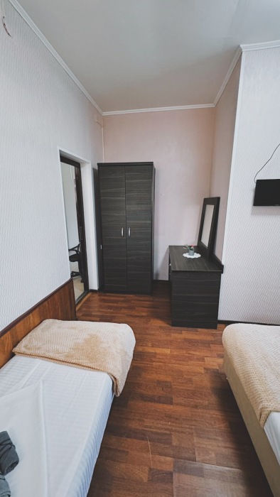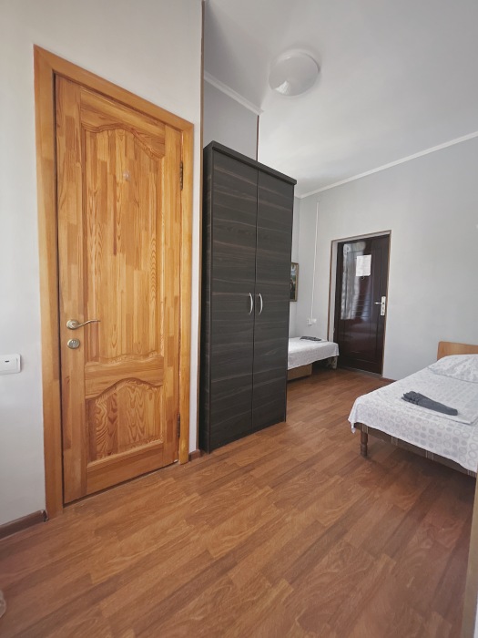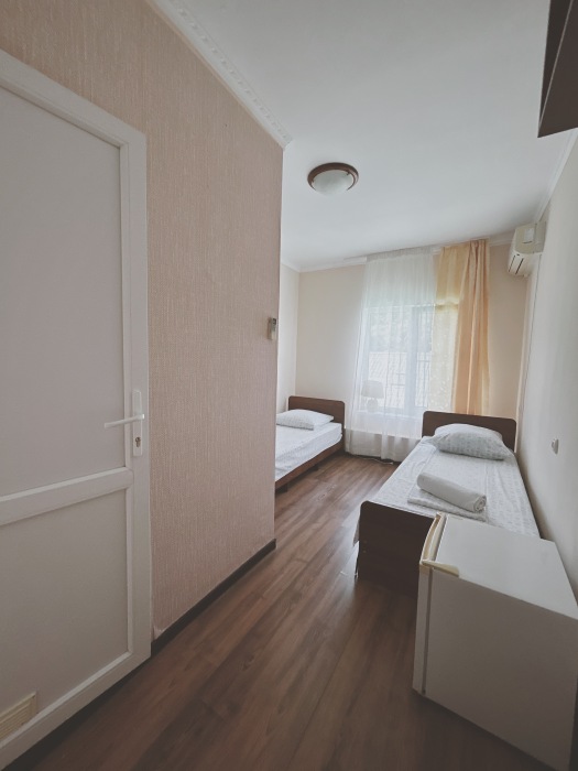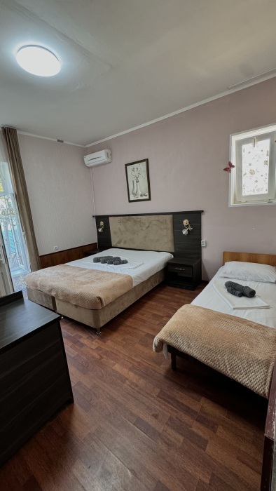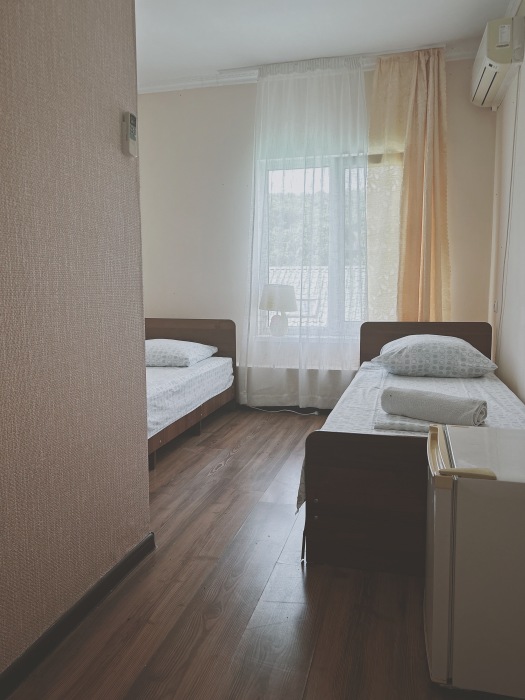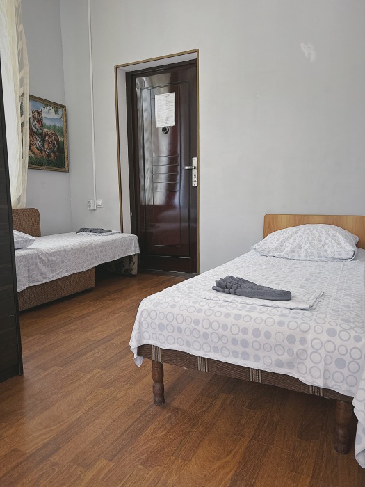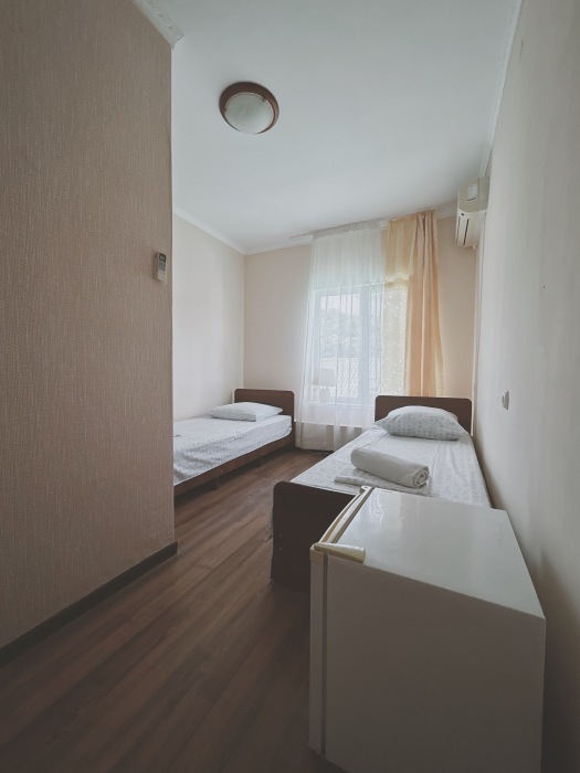 Балкон общий. В номере есть телевизор, стол, пуфик и прикроватные тумбочки. Ванная комната с раковиной, душ, также имеются индивидуальные наборы косметических средств для гостей. Комфортную температуру обеспечивает сплит система кондиционирования.