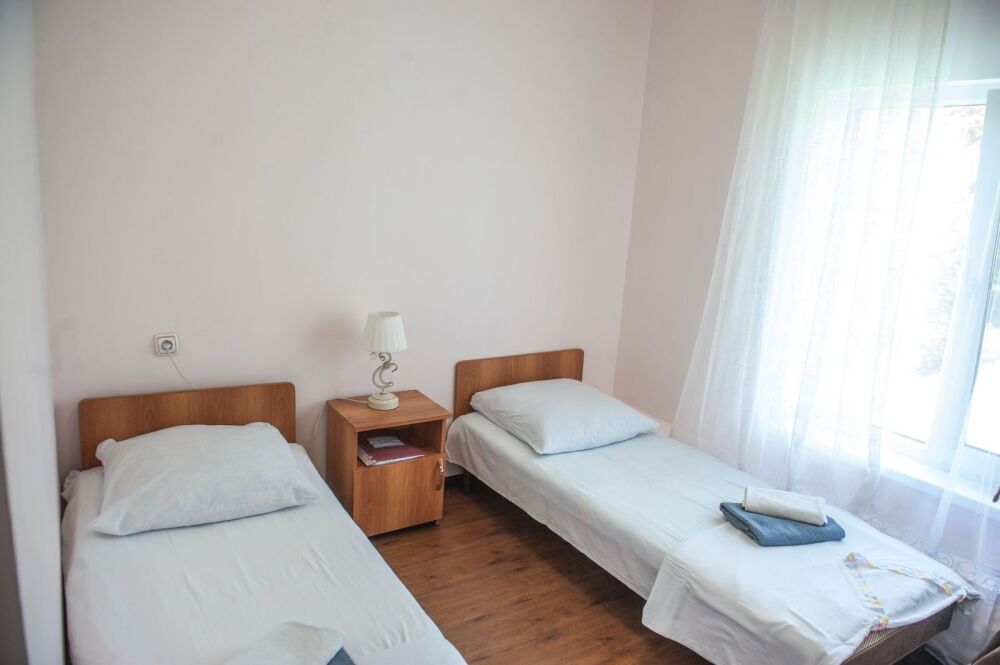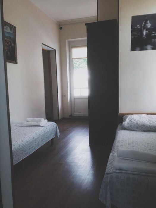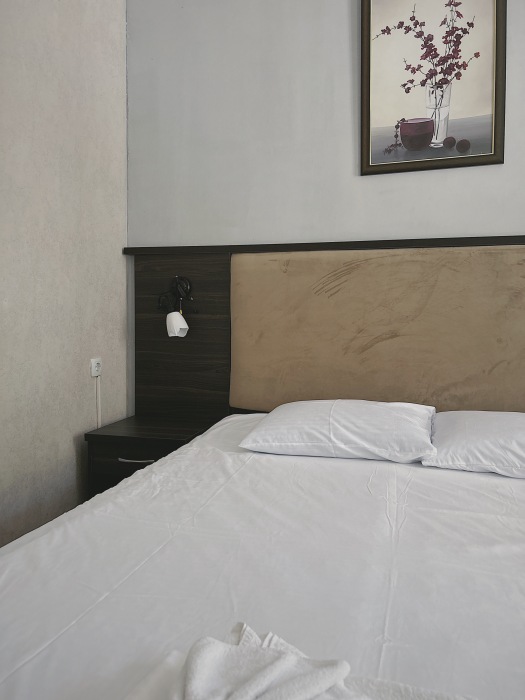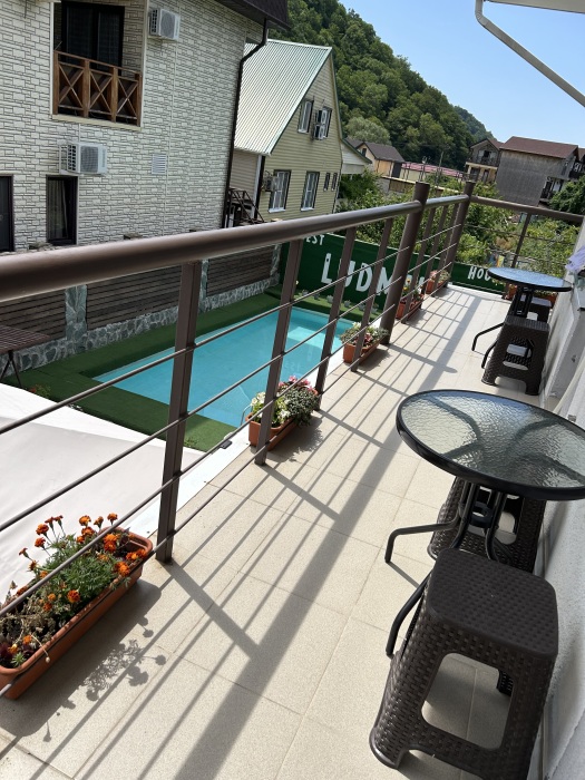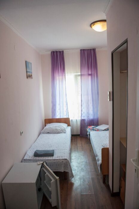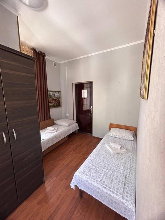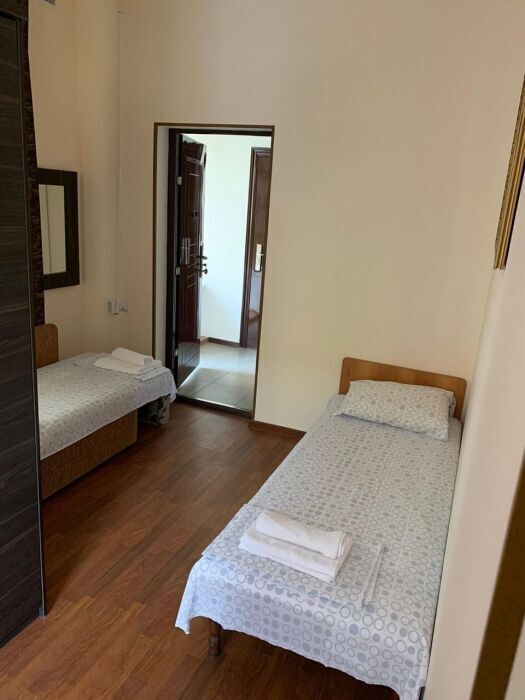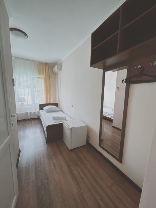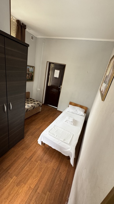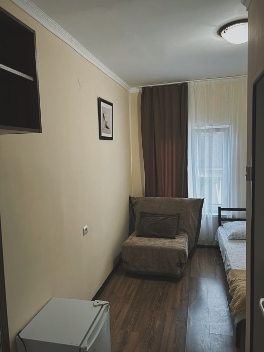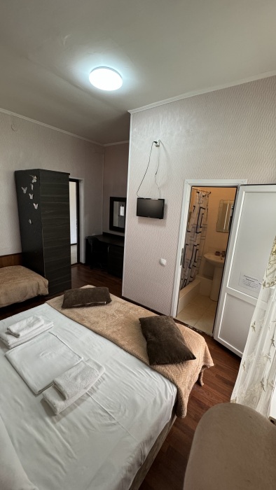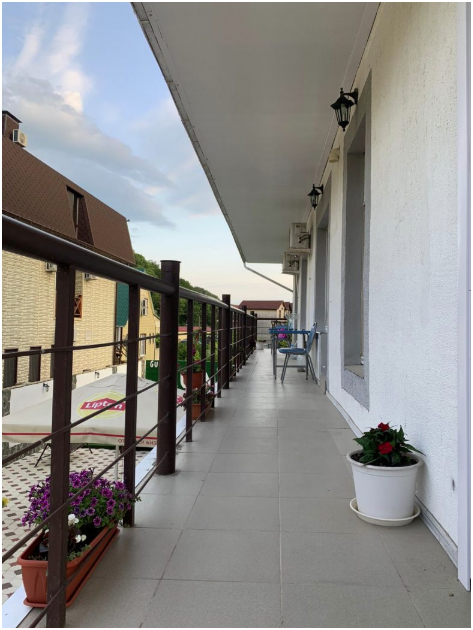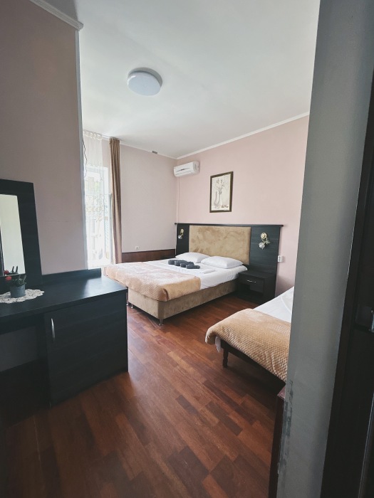 Балкон общий. В номере есть телевизор, стол, пуфик и прикроватные тумбочки. Ванная комната с раковиной, душ, также имеются индивидуальные наборы косметических средств для гостей. Комфортную температуру обеспечивает сплит система кондиционирования.