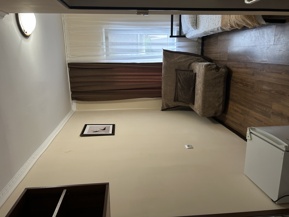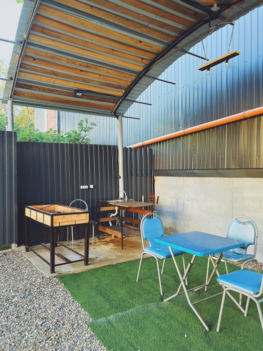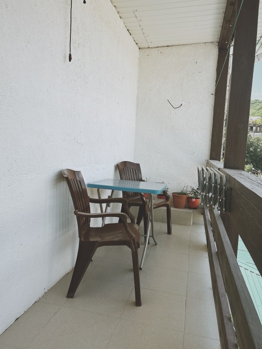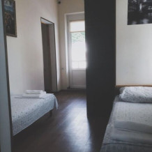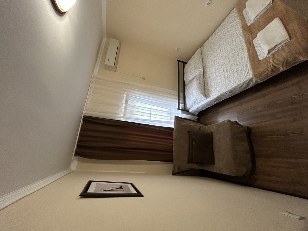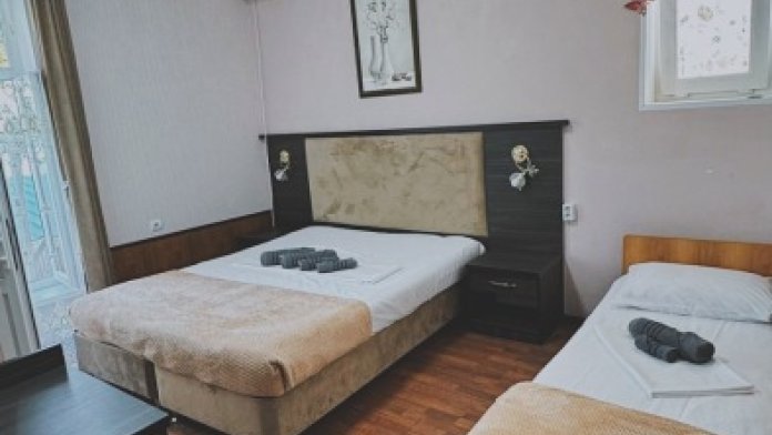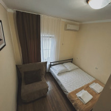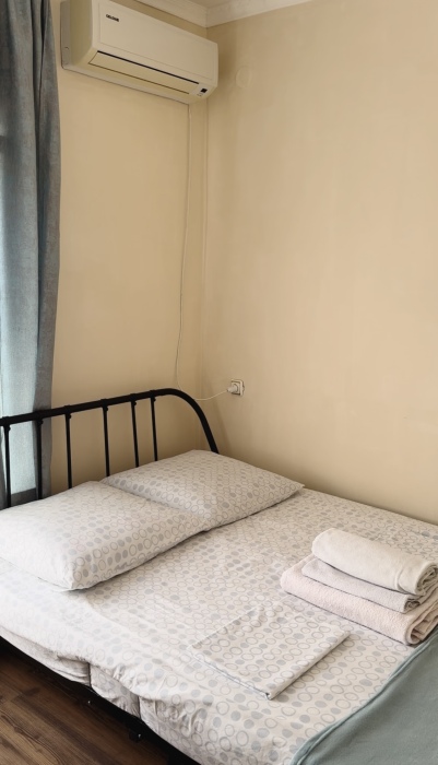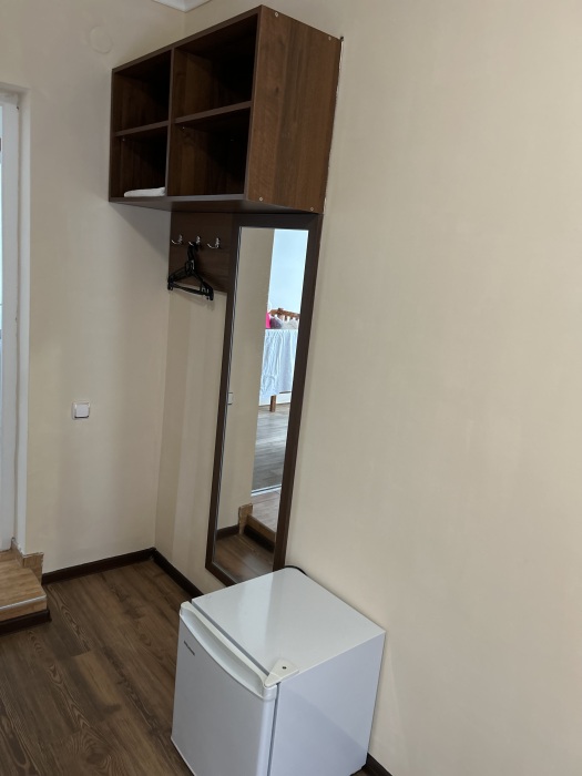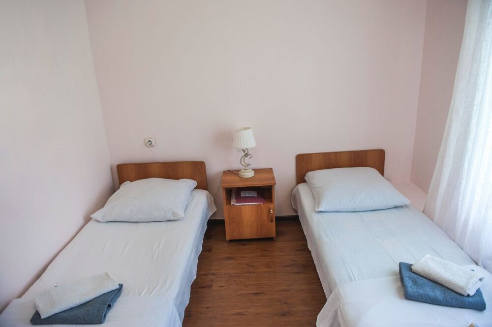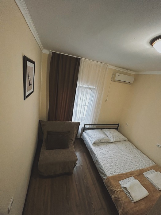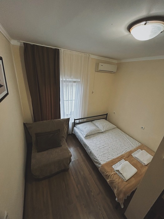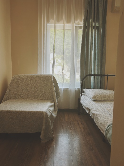 Балкон общий. В номере есть телевизор, стол, пуфик и прикроватные тумбочки. Ванная комната с раковиной, душ, также имеются индивидуальные наборы косметических средств для гостей. Комфортную температуру обеспечивает сплит система кондиционирования.