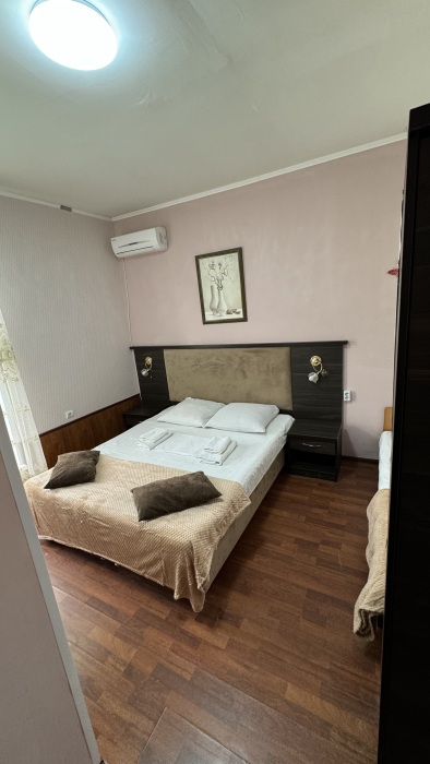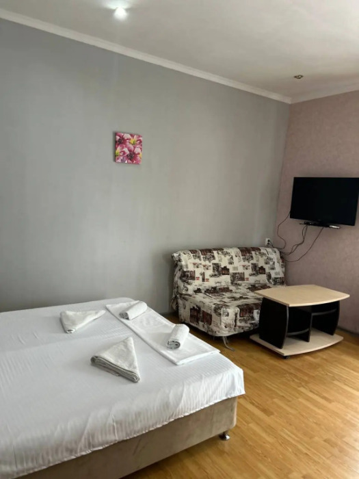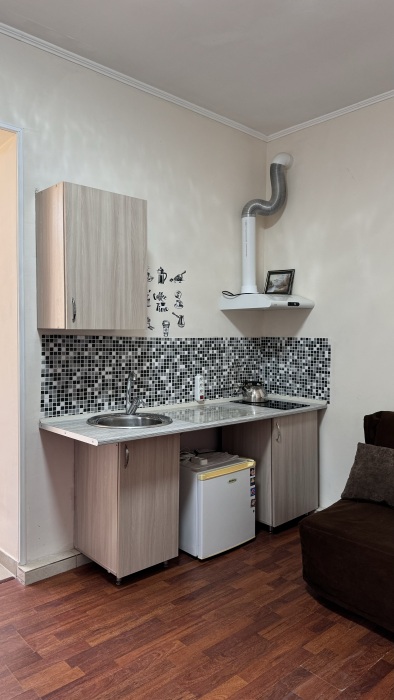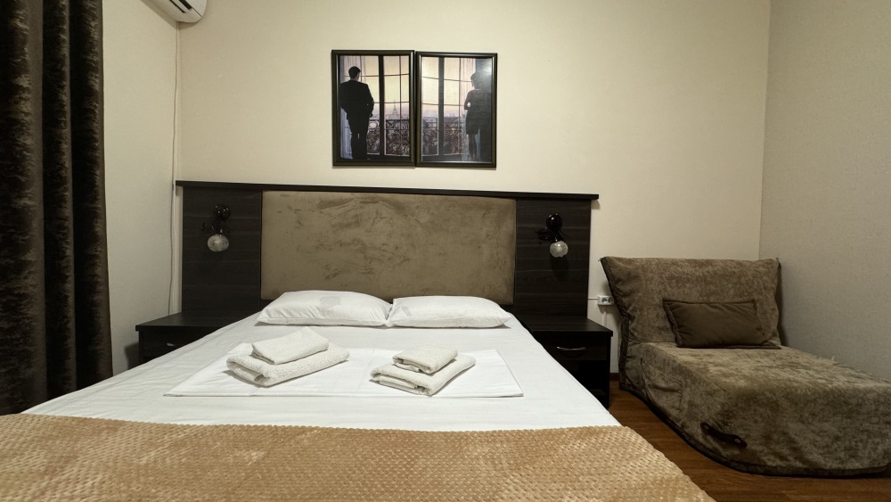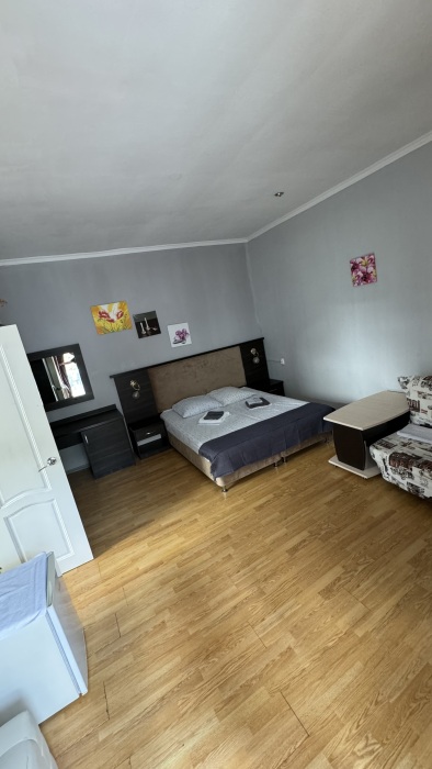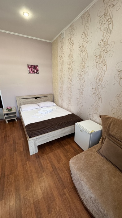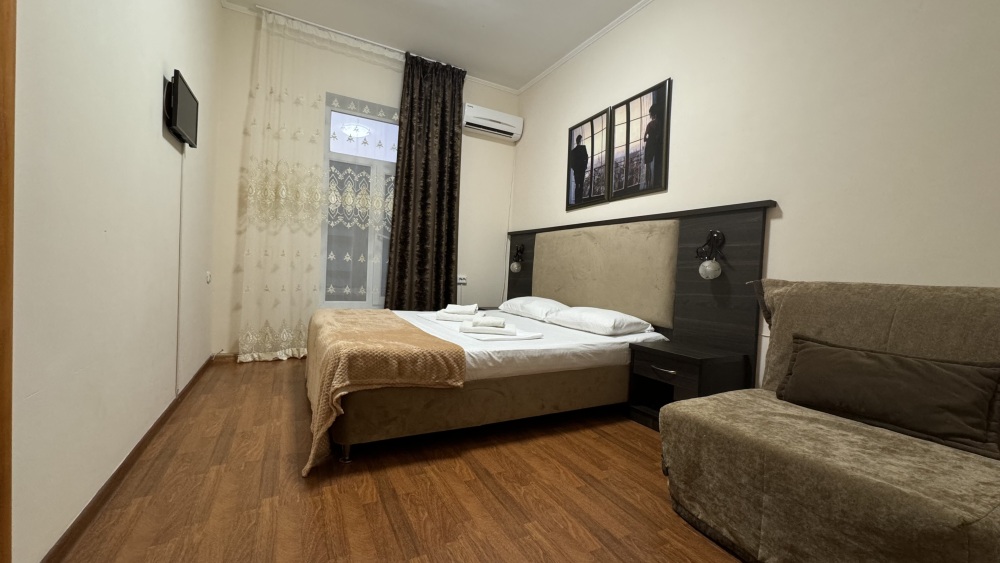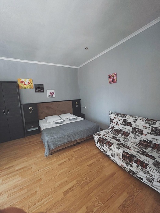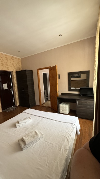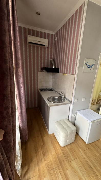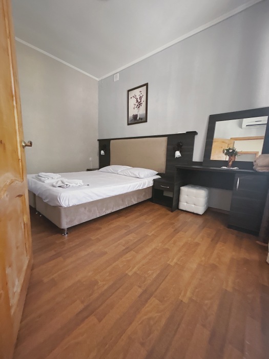 Номер-студия — это однокомнатный номер с кухней,что идеально подходит для длительного проживания. Кухонная зона (мини-кухня): Наличие электрической плиты, холодильника, раковины и набора посуды. Меблировка: Двуспальная кровать,диван-кровать, обеденный стол, стулья, шкаф, рабочее место. Оснащение: Кондиционер, телевизор, Wi-Fi. Ванная комната: Полноценный санузел (душ ), зеркало, набор полотенец, фен, косметические средства. Номер студия отлично подходит для тех, кто предпочитает готовить самостоятельно или путешествует с семьей.