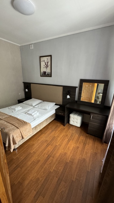 В номере: двуспальная кровать, прикроватные тумбочки, шкаф, туалетный столик, пуфик и прочая мебель. Во второй комнате расположены две односпальные кровати