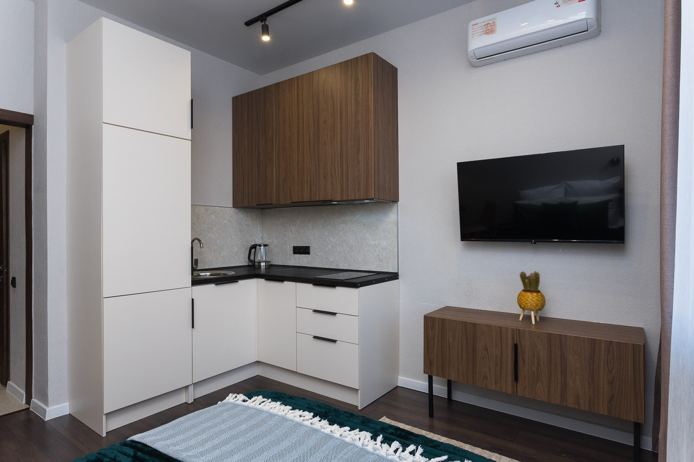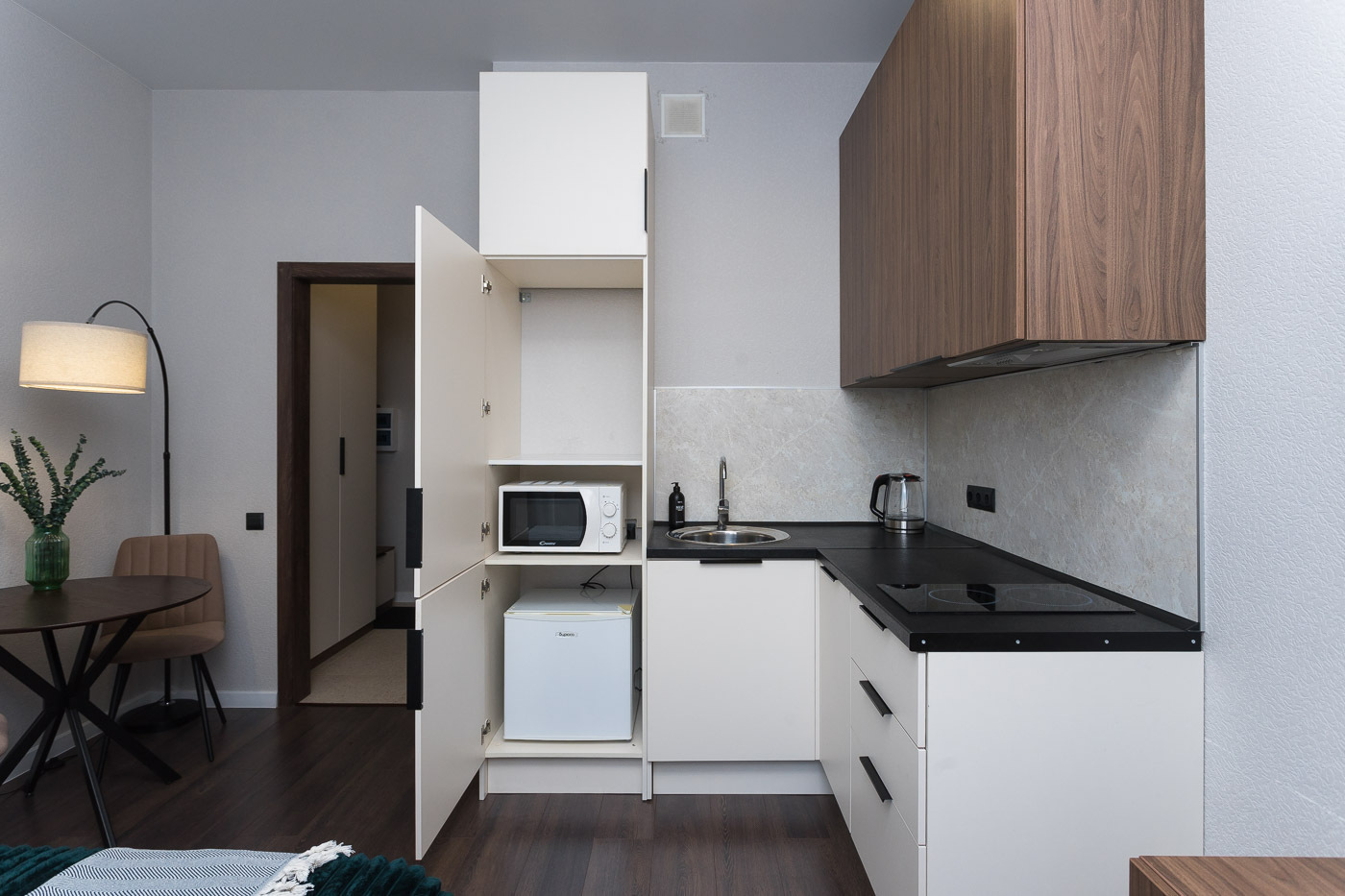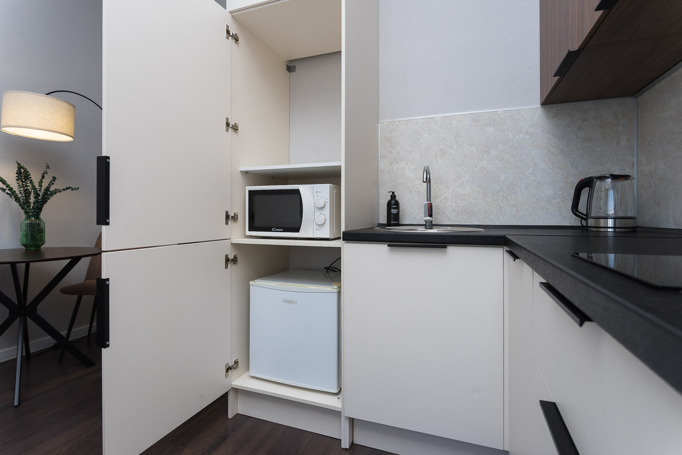 Апартаменты оснащены кухонным гарнитуром с комплектом посуды и всей бытовой техникой (варочная поверхность 2 комфорки, холодильник с морозильной камерой, посудомоечная машина, микроволновая печь, чайник).