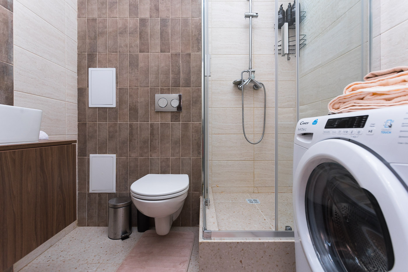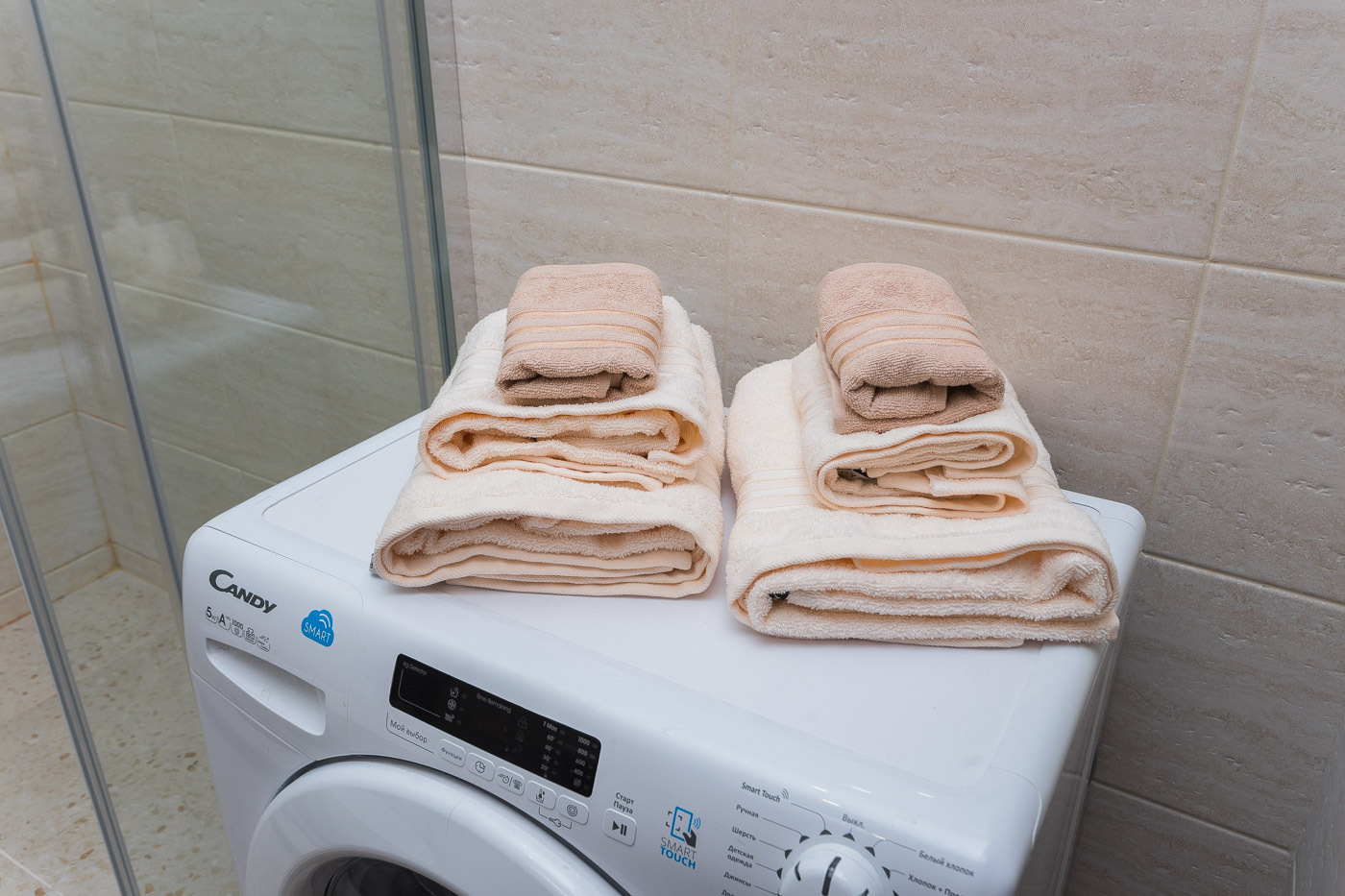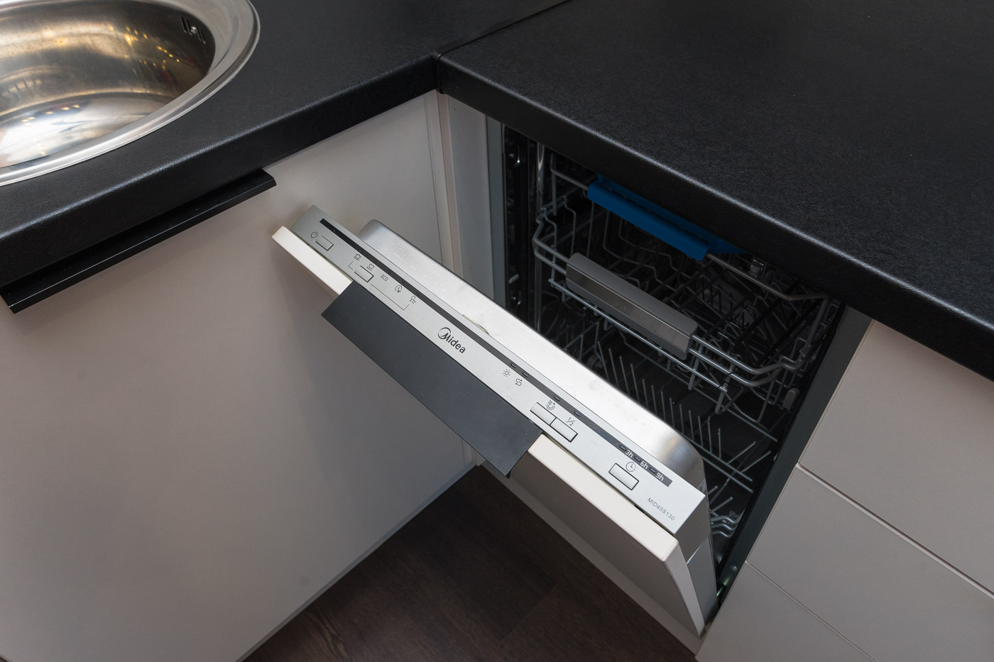 Апартаменты оснащены кухонным гарнитуром с комплектом посуды и всей бытовой техникой (варочная поверхность 2 комфорки, холодильник с морозильной камерой, посудомоечная машина, микроволновая печь, чайник).