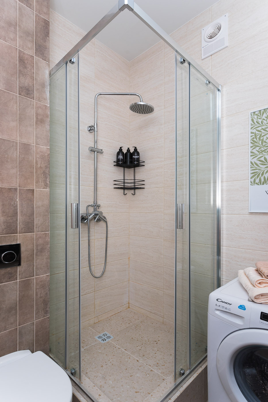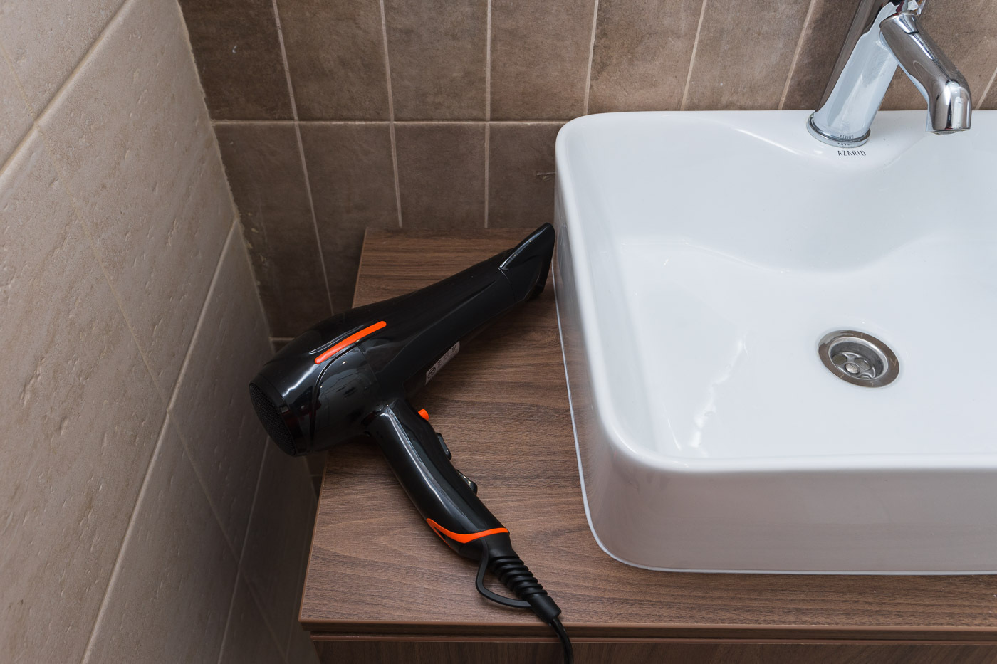 Имеется фен, комплект полотенец на одного гостя 3 вида полотенец, одноразовые гигиенические принадлежности (зубной набор, шампунь, бальзам для волос, мыло).