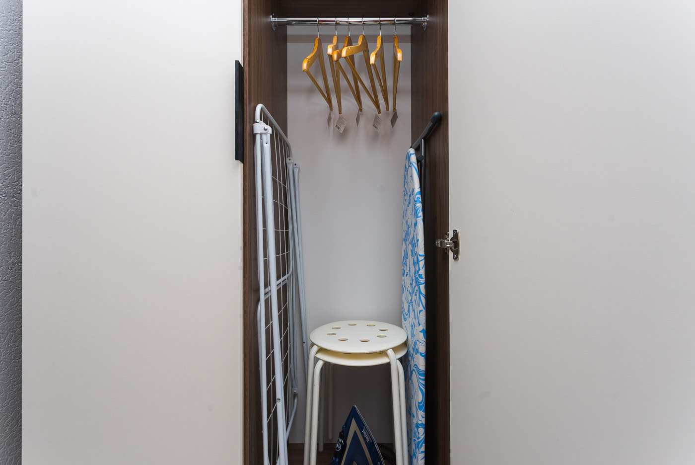 Аксессуары для дома: утюг, гладильная доска, сушилка для белья, плечики.
