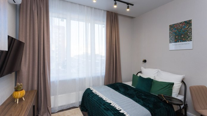 Двуспальная кровать (160*200) с ортопедическим матрасом, телевизор с плоским экраном и бесплатной подпиской на онлайн-кинотеатр.
