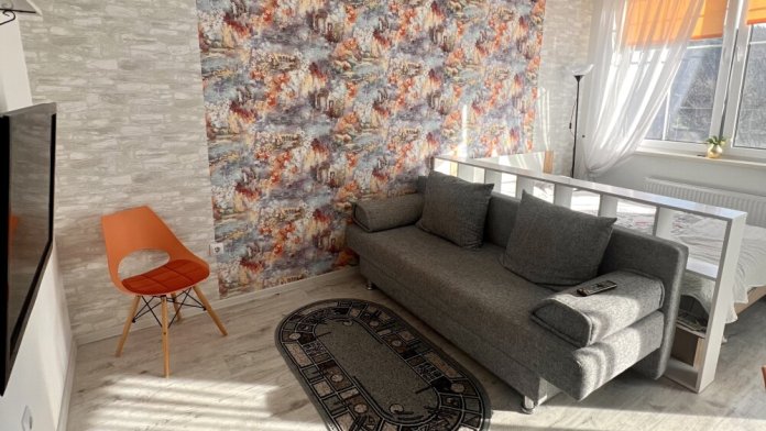 Комфортное размещение до 4 гостей: кровать и раскладной диван.