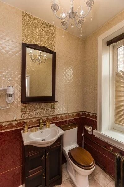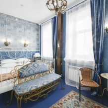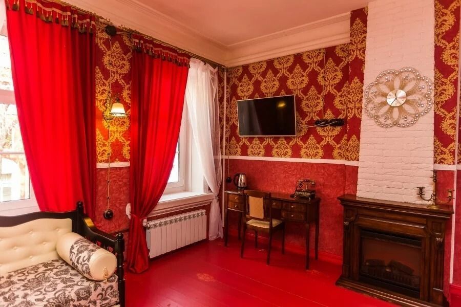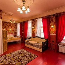 Интерьер отличается обилием благородного красного цвета и золота. Особенностью номера является электрический камин, который в вечернее время создает для гостей теплую и уютную атмосферу. Пол в комнате изготовлен из массивных досок сибирской сосны.