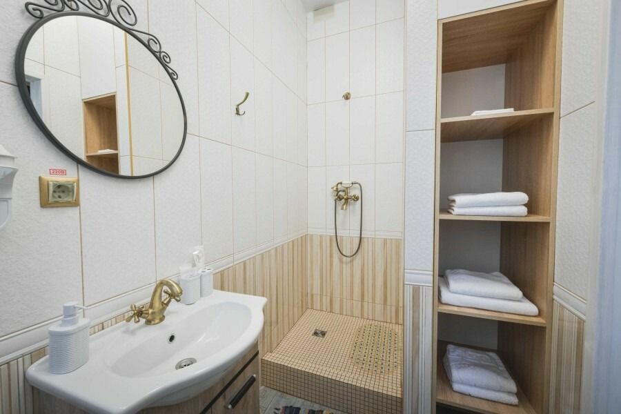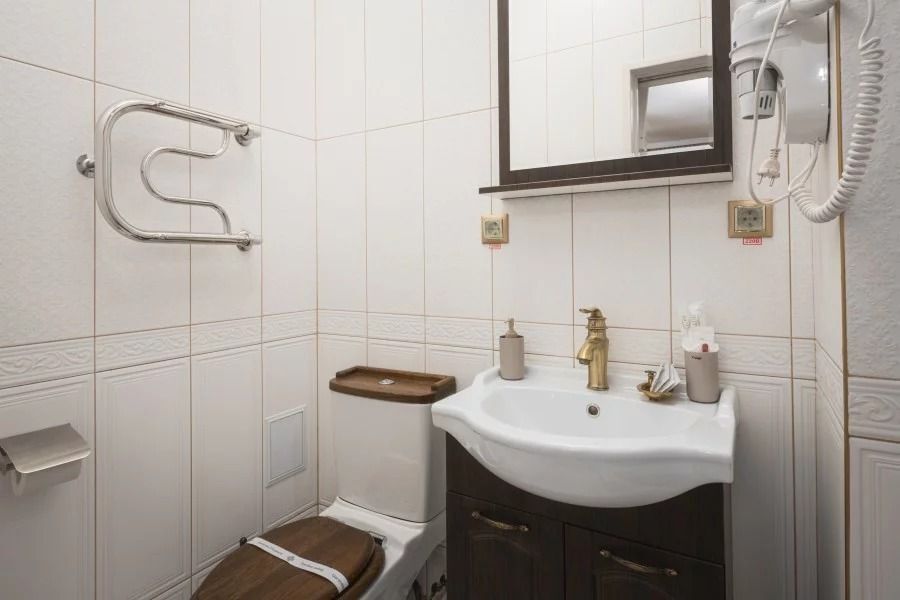 В номере: широкая кровать с матрасом повышенной комфортности, 4 подушки, большой и удобный шкаф, кресло, телевизор, обеденная зона, столик, чайник, холодильник, просторная ванная комната с феном и принадлежностями.