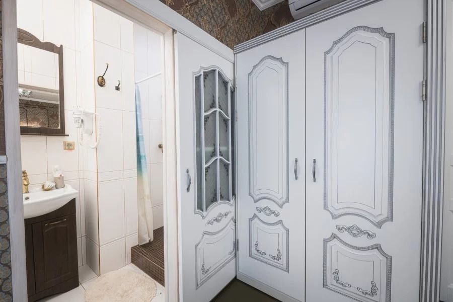В номере: широкая кровать с матрасом повышенной комфортности, 4 подушки, большой и удобный шкаф, обеденная зона, телевизор, столик для чаепития, чайник, холодильник, просторная ванная комната с феном и принадлежностями.