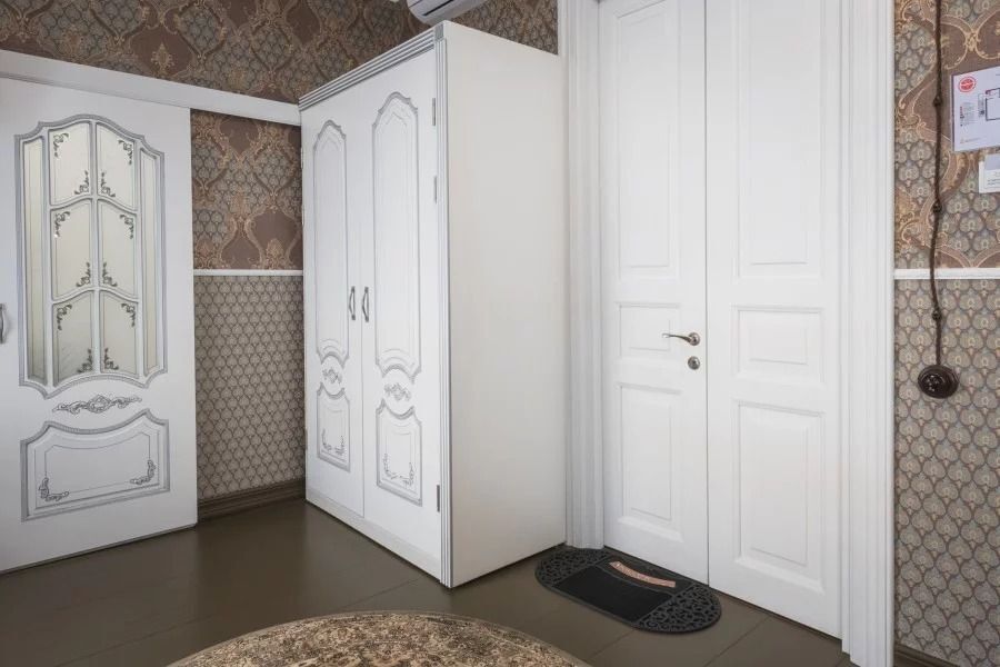 Белая акцентная мебель, двери и молдинги на стенах и потолке, расширяя пространство, придают комнате особую легкость и шарм. Пол в номере изготовлен из массивных досок сибирской сосны.