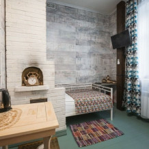 Уютный одноместный номер в стиле традиционного русского дома. Подходит для тех, кто любит тишину и комфорт. Особенностью номера является спальное место, расположенное за «русской печкой», а также необычные элементы декора. Пол в номере изготовлен из массивных досок сибирской сосны.