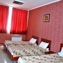 В номере: четыре односпальные кровати, платяной шкаф, тумбочки, туалетный столик, ЖК телевизор, кабельное ТВ, интернет, чайник, фен, гигиенические принадлежности.