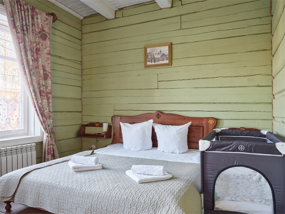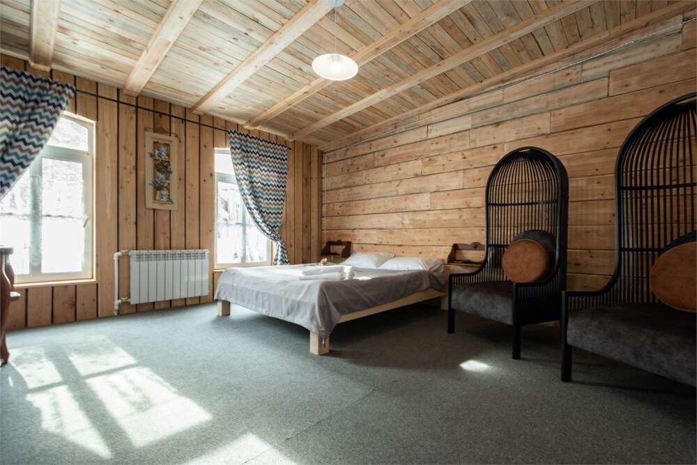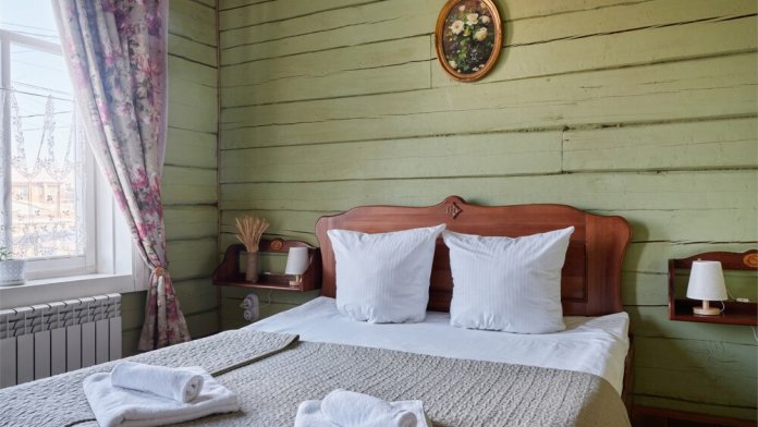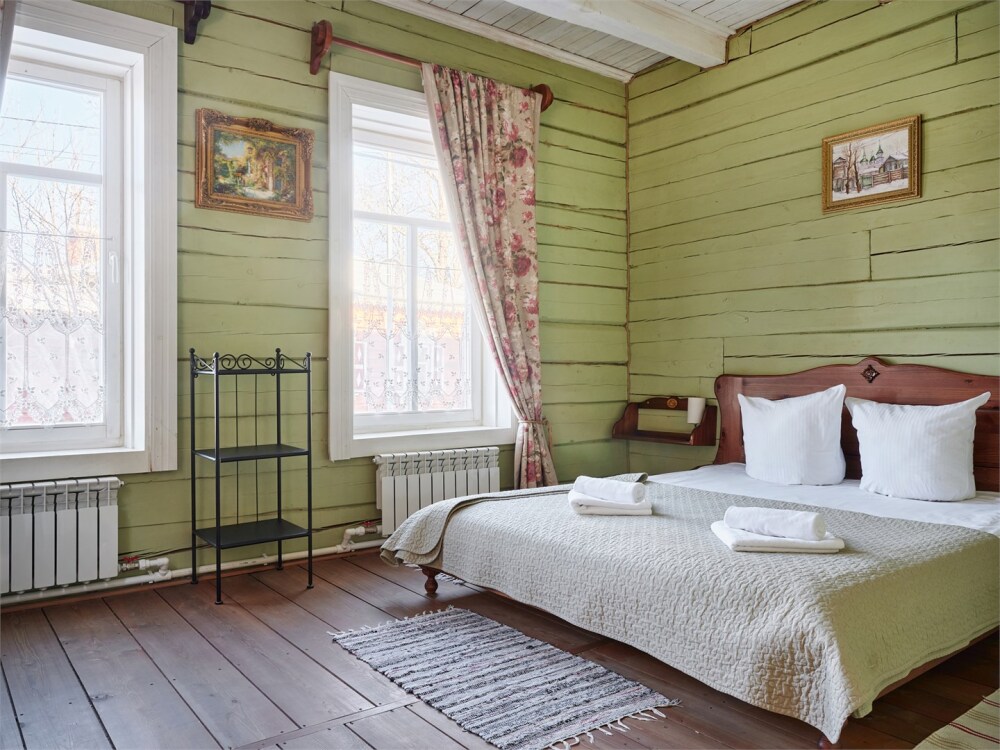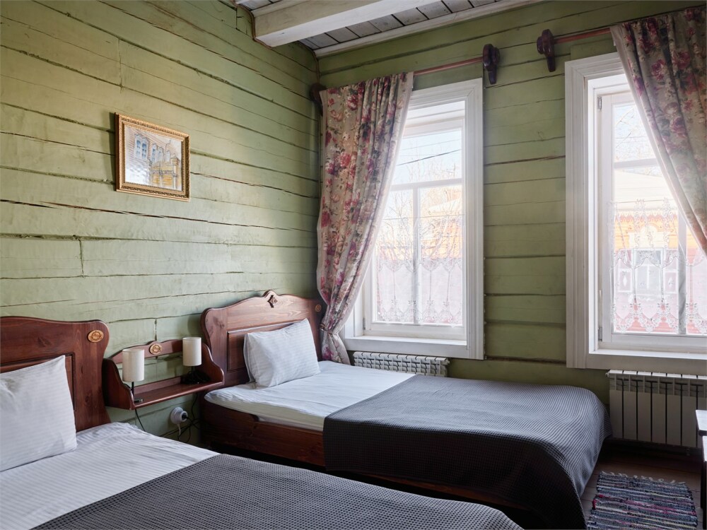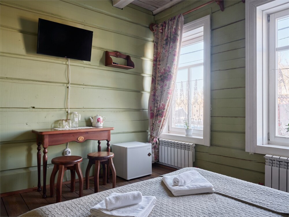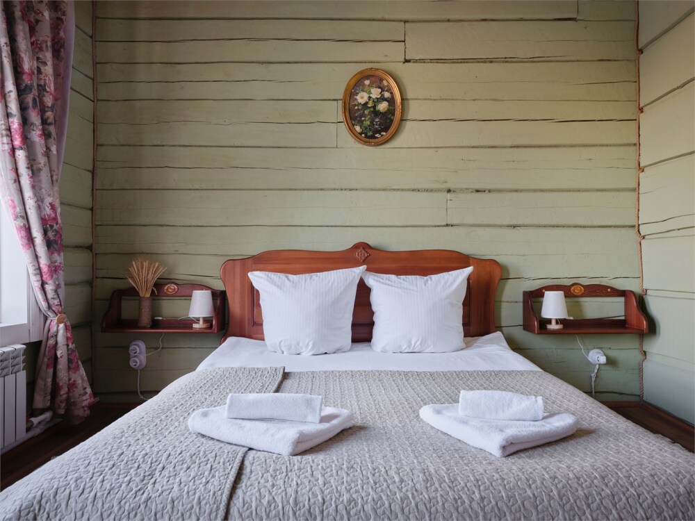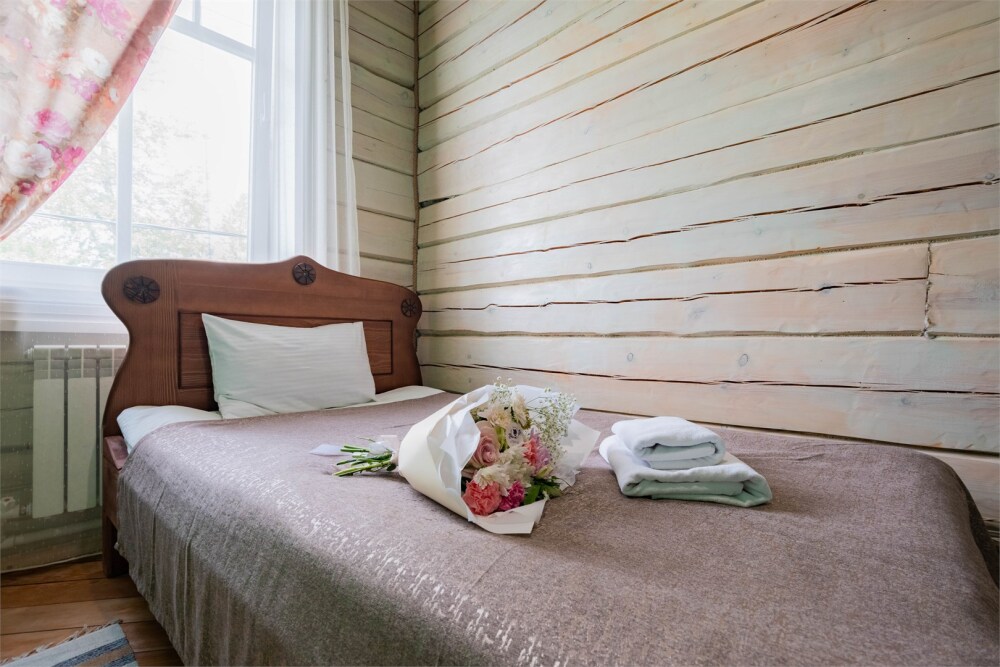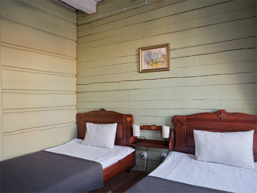 Номерной фонд состоит из 15 номеров. Находится в центре, но в стороне от шумных улиц. В деревянном доме приятно дышать и очень сладко спать. Мебель и все предметы интерьера из дерева. Французское кружево на окнах дарит эстетическое наслаждение взгляду, а плотные блэкаут шторы помогут выспаться в любое время суток. Оригинально оформленные туалетные комнаты, удобный душ, раковина и унитаз в каждом номере. Кровати, сделаны под заказ, конечно, из дерева. Самая маленькая кровать - полуторная, размер 120*200, комфортно даже мамочке с ребенком. В номере люкс кровать размера kingsize - 180*200.