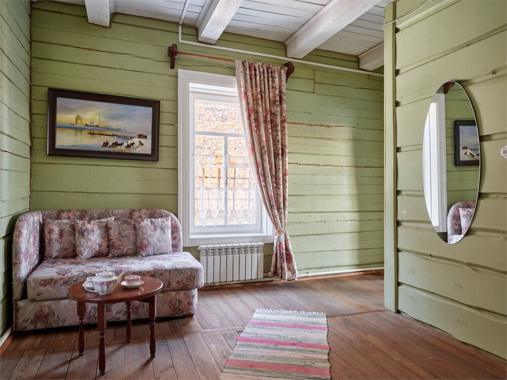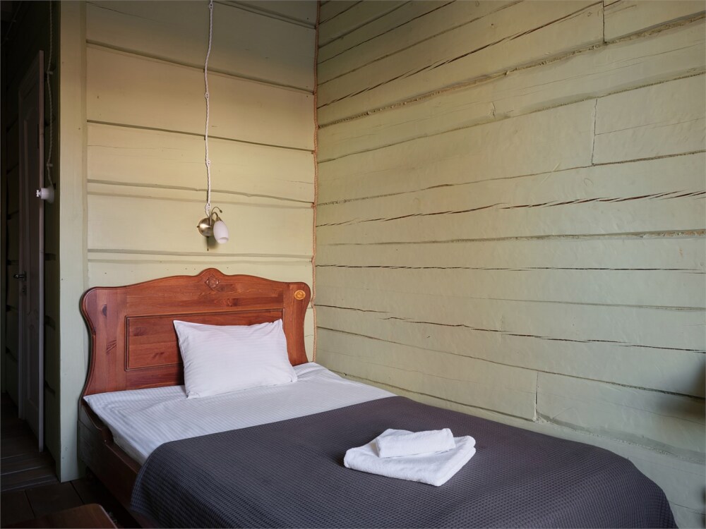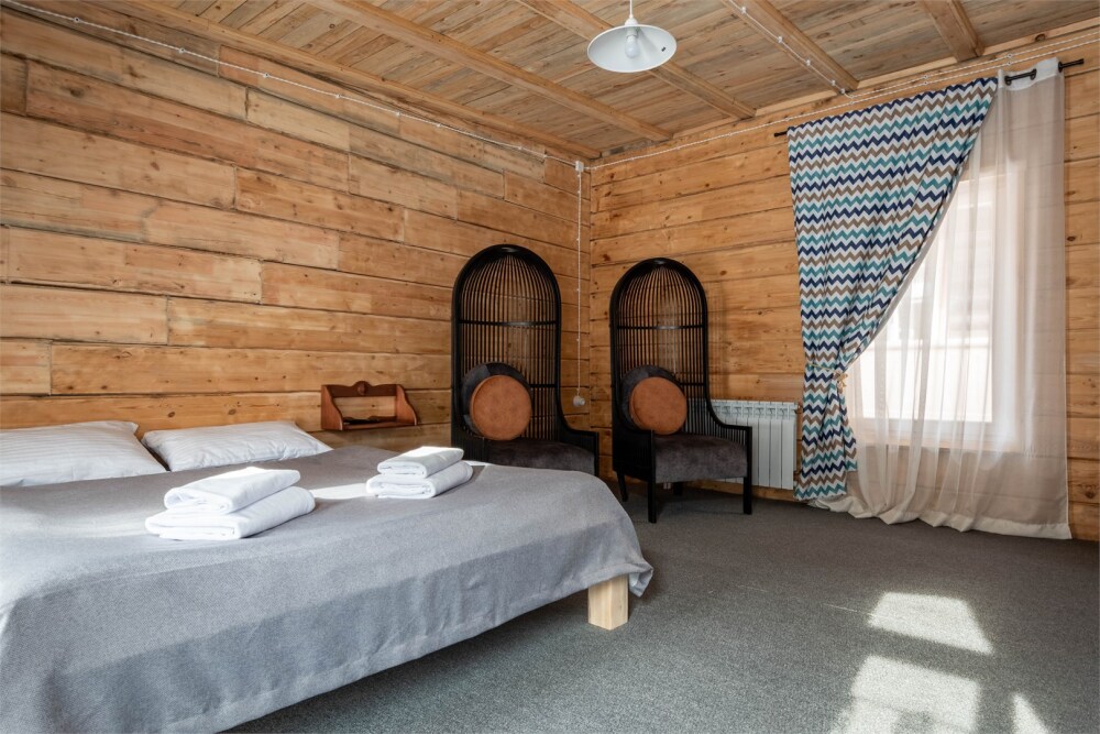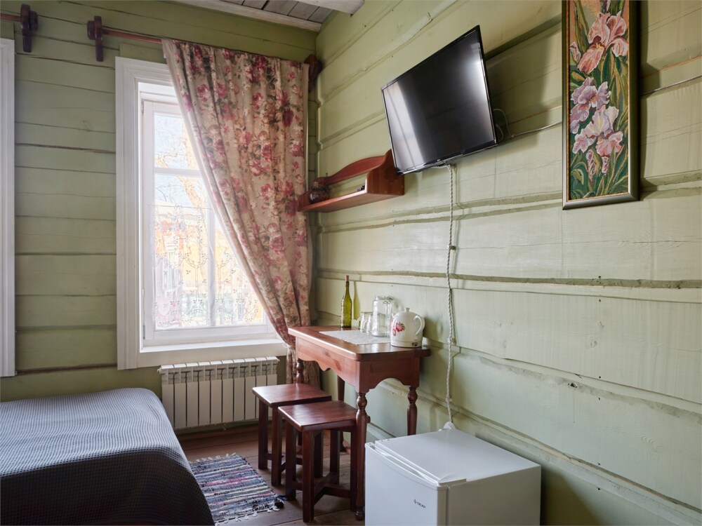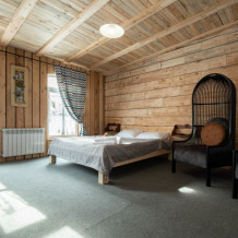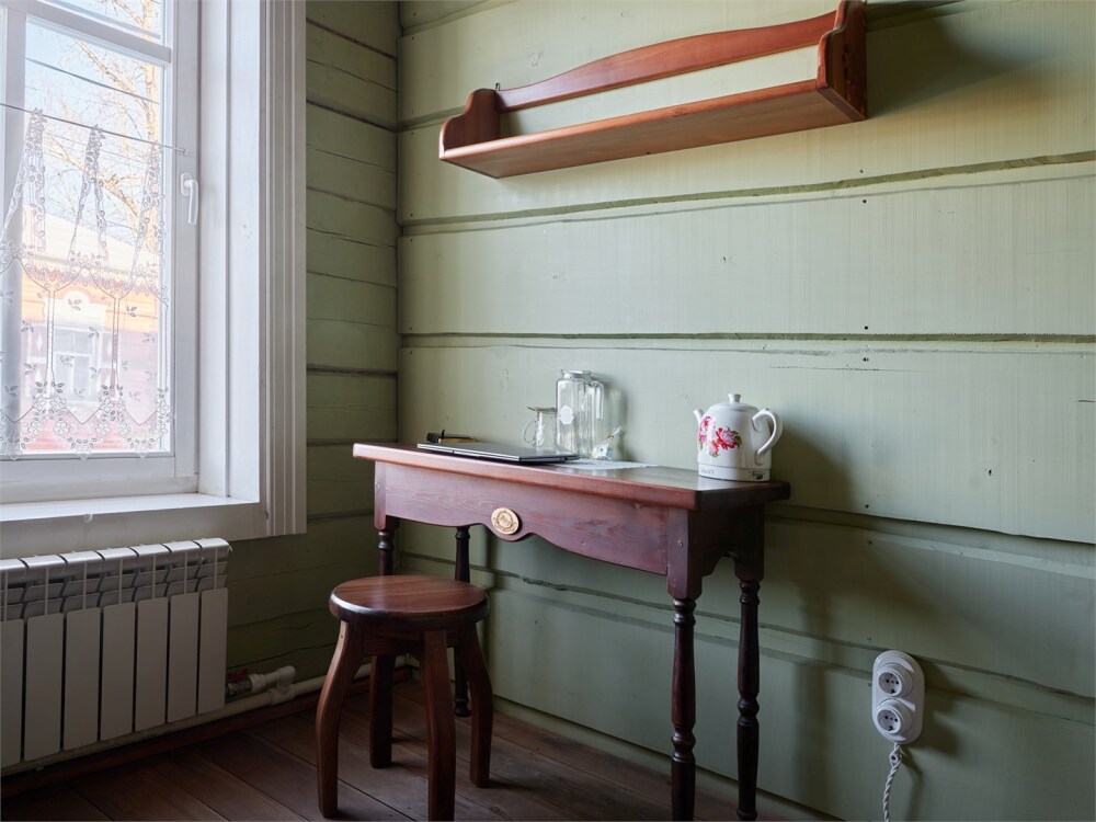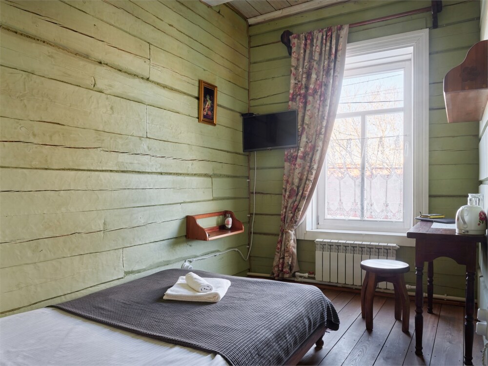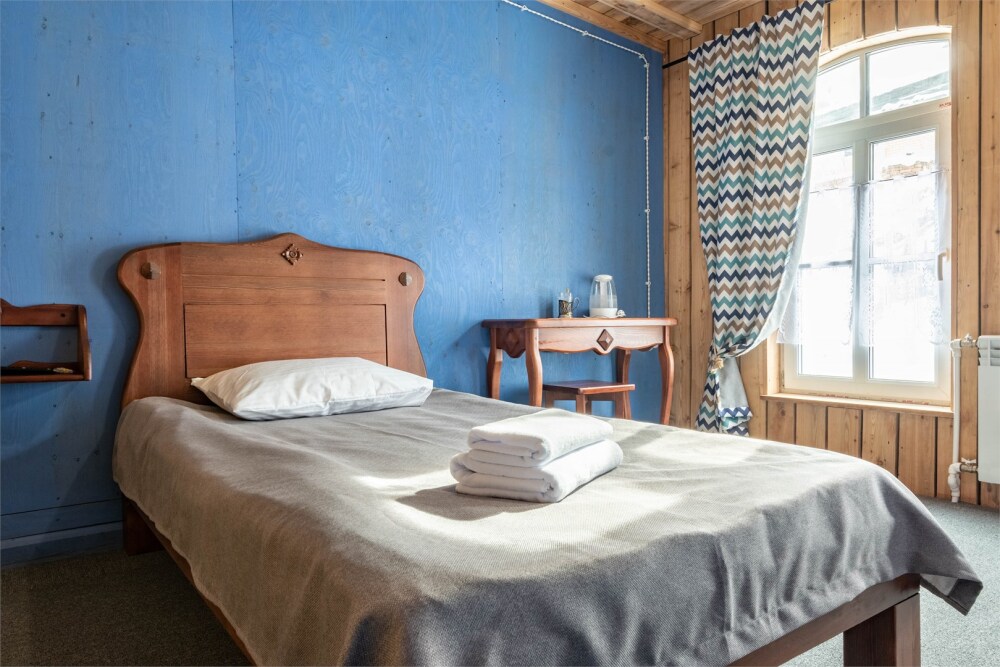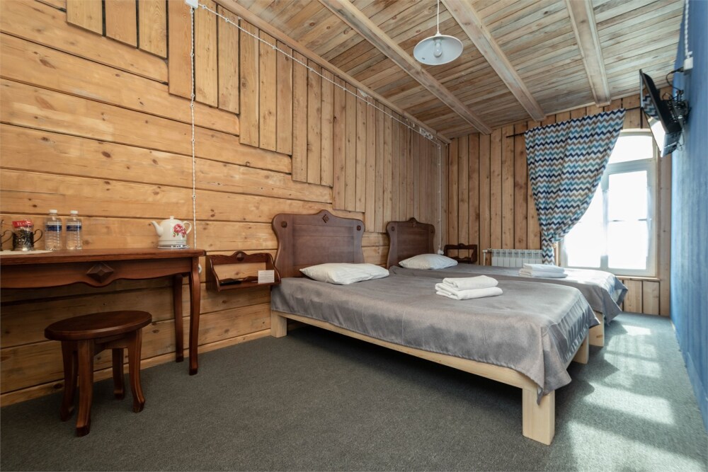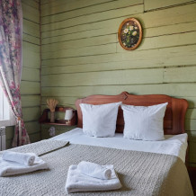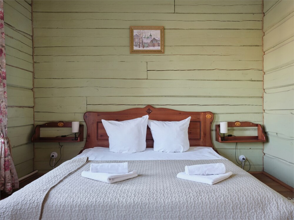 Номерной фонд состоит из 15 номеров. Находится в центре, но в стороне от шумных улиц. В деревянном доме приятно дышать и очень сладко спать. Мебель и все предметы интерьера из дерева. Французское кружево на окнах дарит эстетическое наслаждение взгляду, а плотные блэкаут шторы помогут выспаться в любое время суток. Оригинально оформленные туалетные комнаты, удобный душ, раковина и унитаз в каждом номере. Кровати, сделаны под заказ, конечно, из дерева. Самая маленькая кровать - полуторная, размер 120*200, комфортно даже мамочке с ребенком. В номере люкс кровать размера kingsize - 180*200.