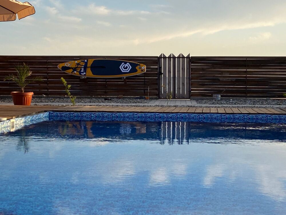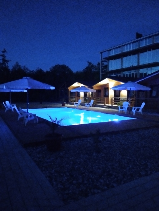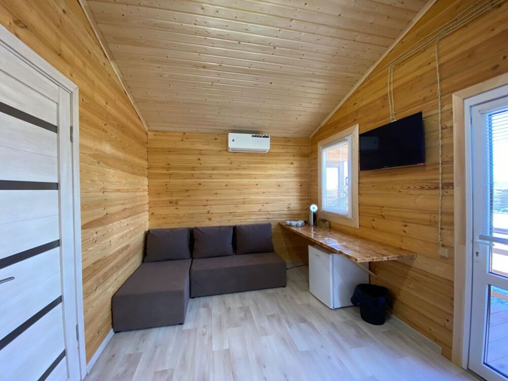 Домики из трех комнат: две спальни, прихожая, санузел. В каждом доме одна двуспальная кровать и две односпальные , раскладной диван, телевизор, кондиционер, холодильник, чайник, посуда, чай-кофе, туалетные принадлежности.