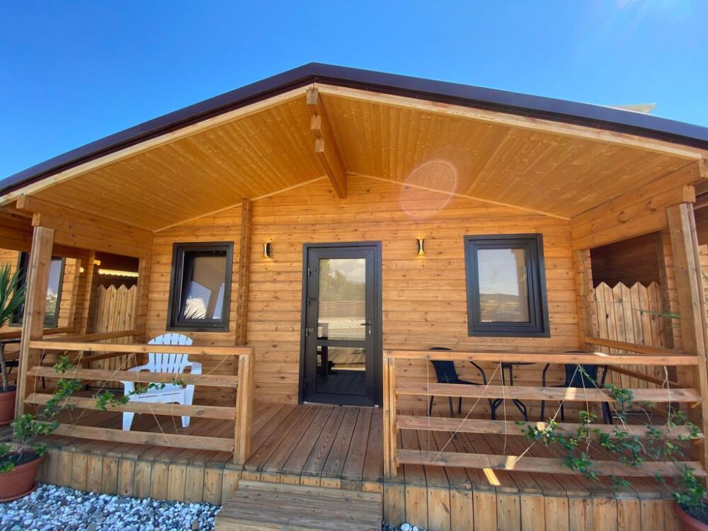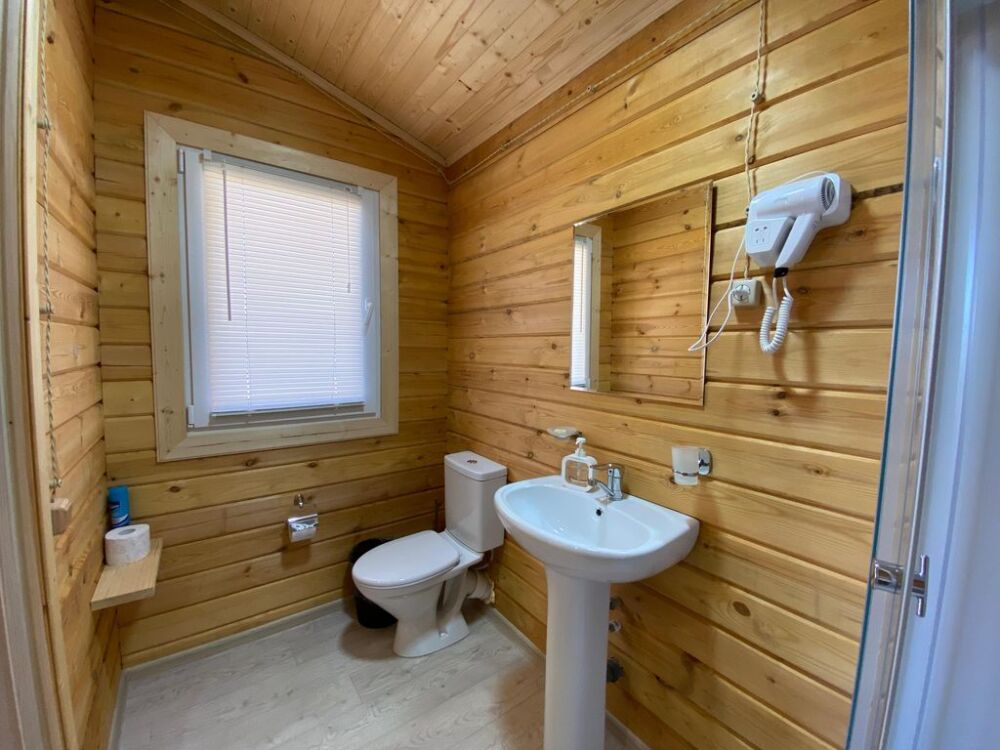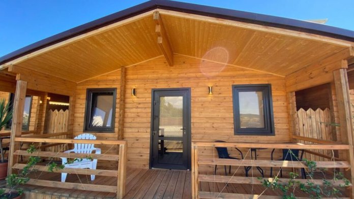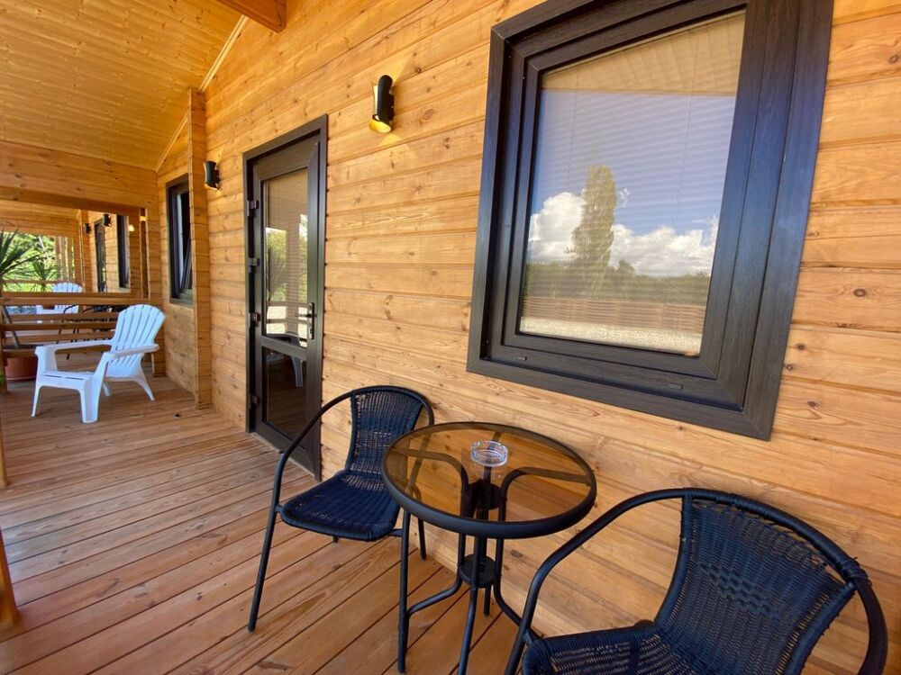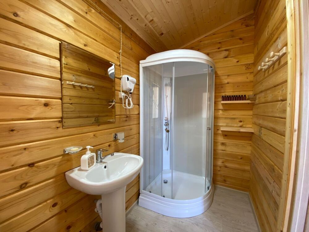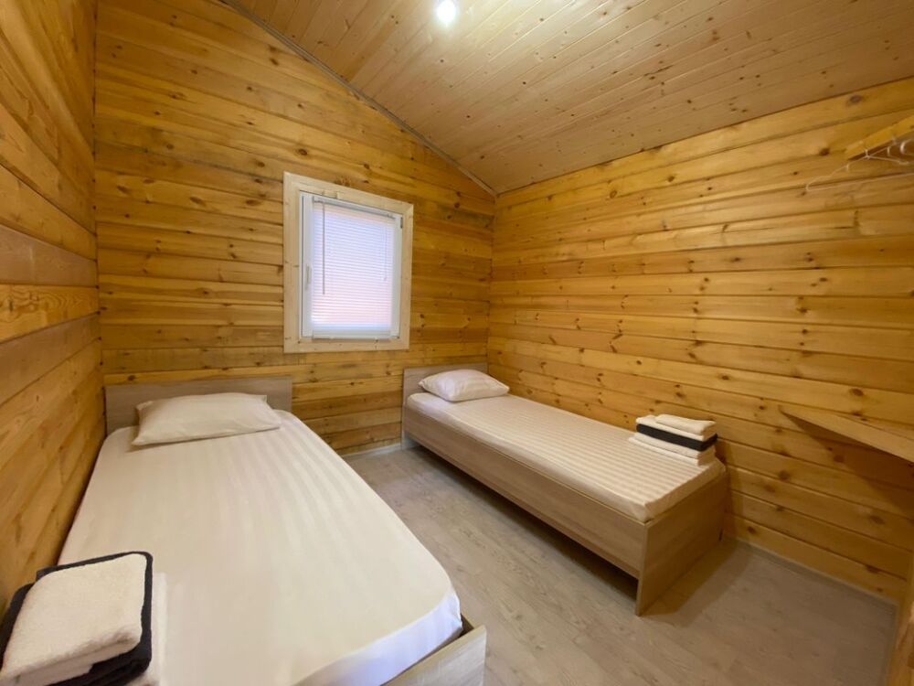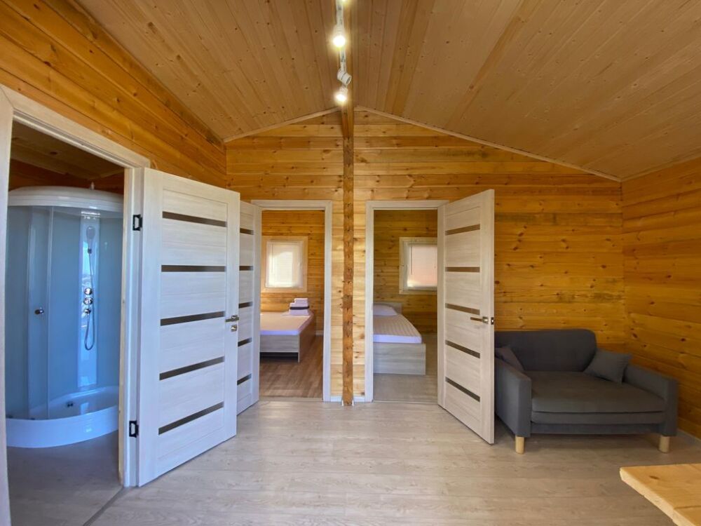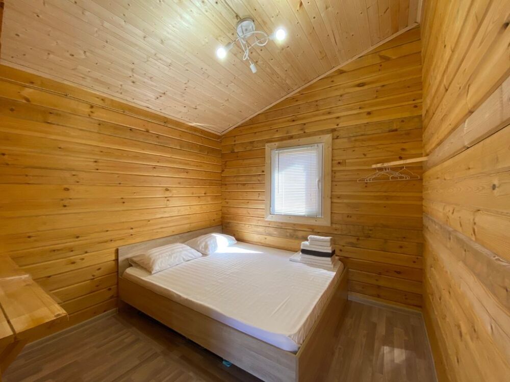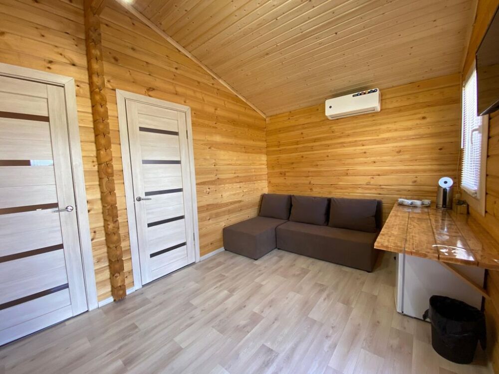Домики выполнены из бруса большого диаметра, что позволяет принимать гостей круглый год.
