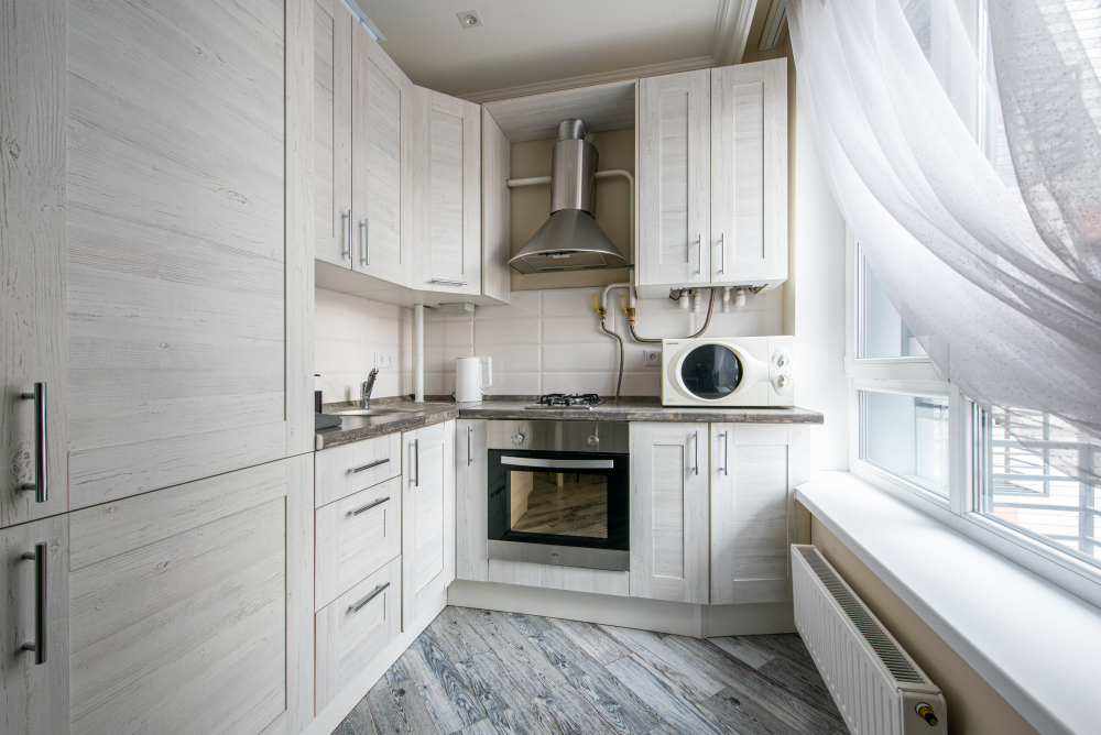 - Полностью оборудованную кухню: чайник, плита, духовой шкаф, холодильник, микроволновая печь и всё необходимое для готовки.