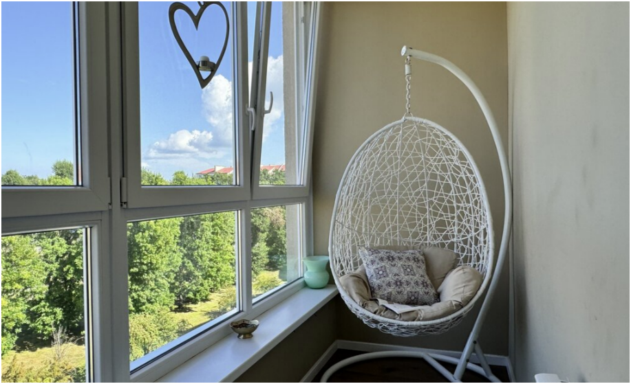 - Лоджия с креслом качелью, прекрасный вид из окна.