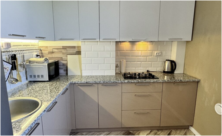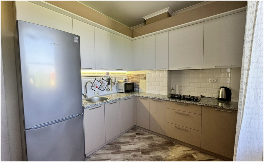 - На кухне чайник, газовая плита, микроволновая печь, большой холодильник, вся необходимая утварь и посуда.