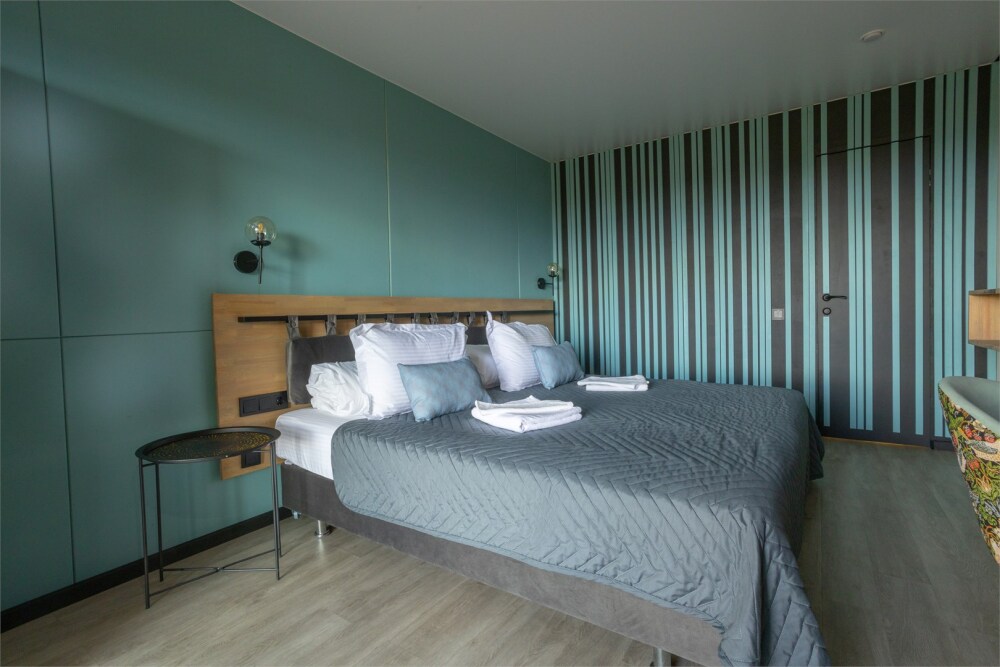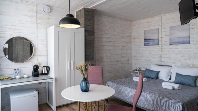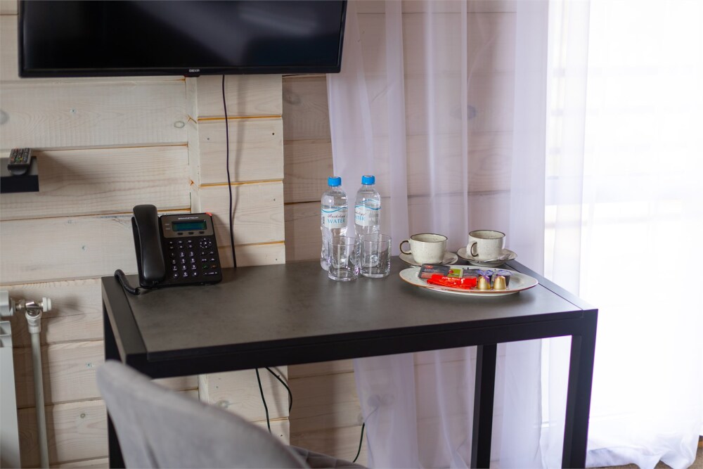 Комплектация номера: зона для чаепития с кофейным столиком и кофе машиной, теплые полы, 2 односпальные кровати или кровать King-Size, ванная комната с эко косметикой премиум класса.