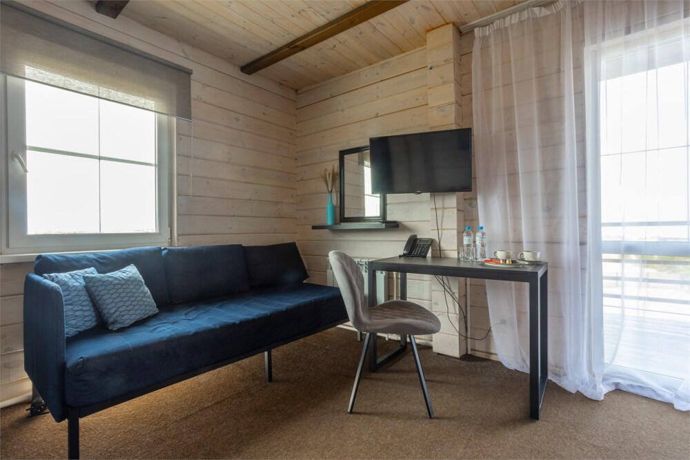 Комплектация номера: зона для чаепития с кофейным столиком и кофе машиной, 2 односпальных кровати или кровать King Size, мягкий диван-софа, ванная комната с эко-косметикой премиум класса.