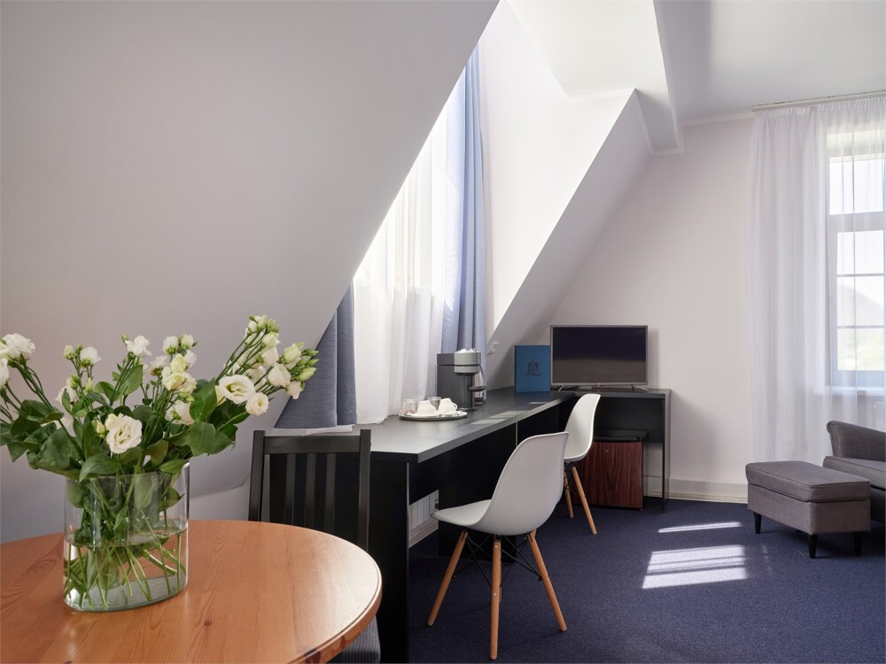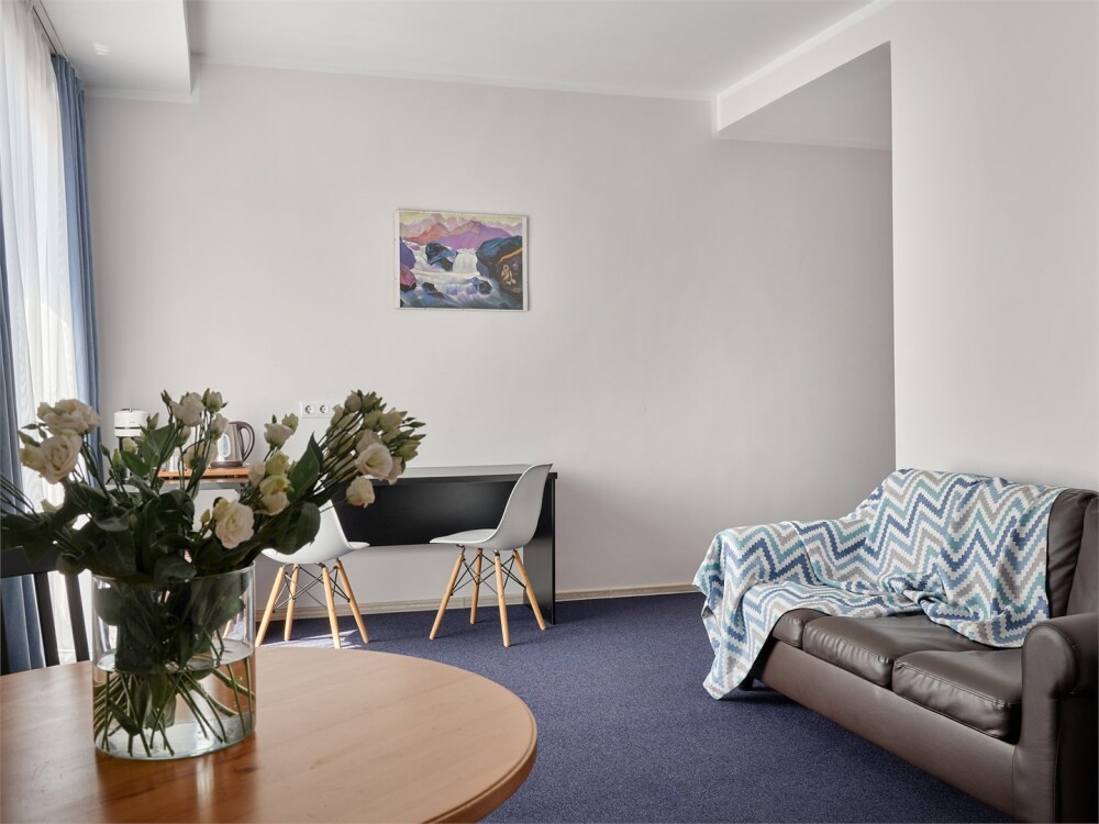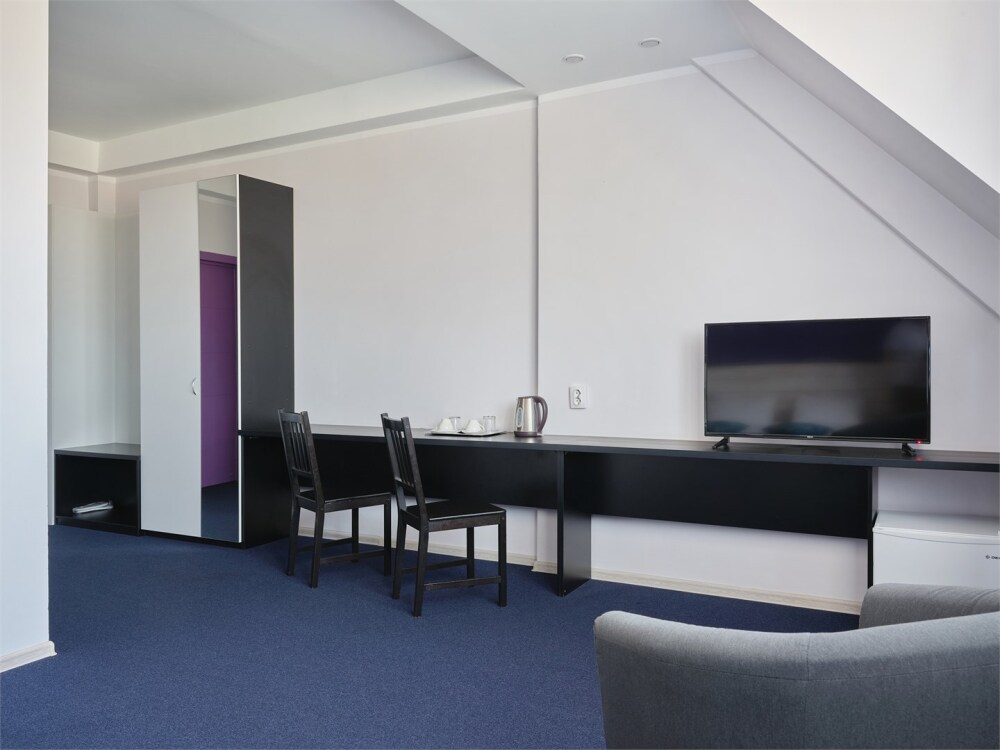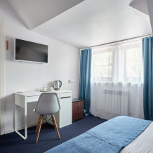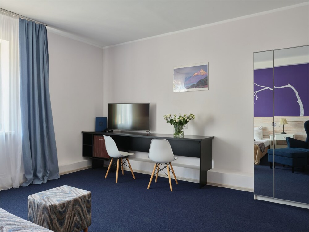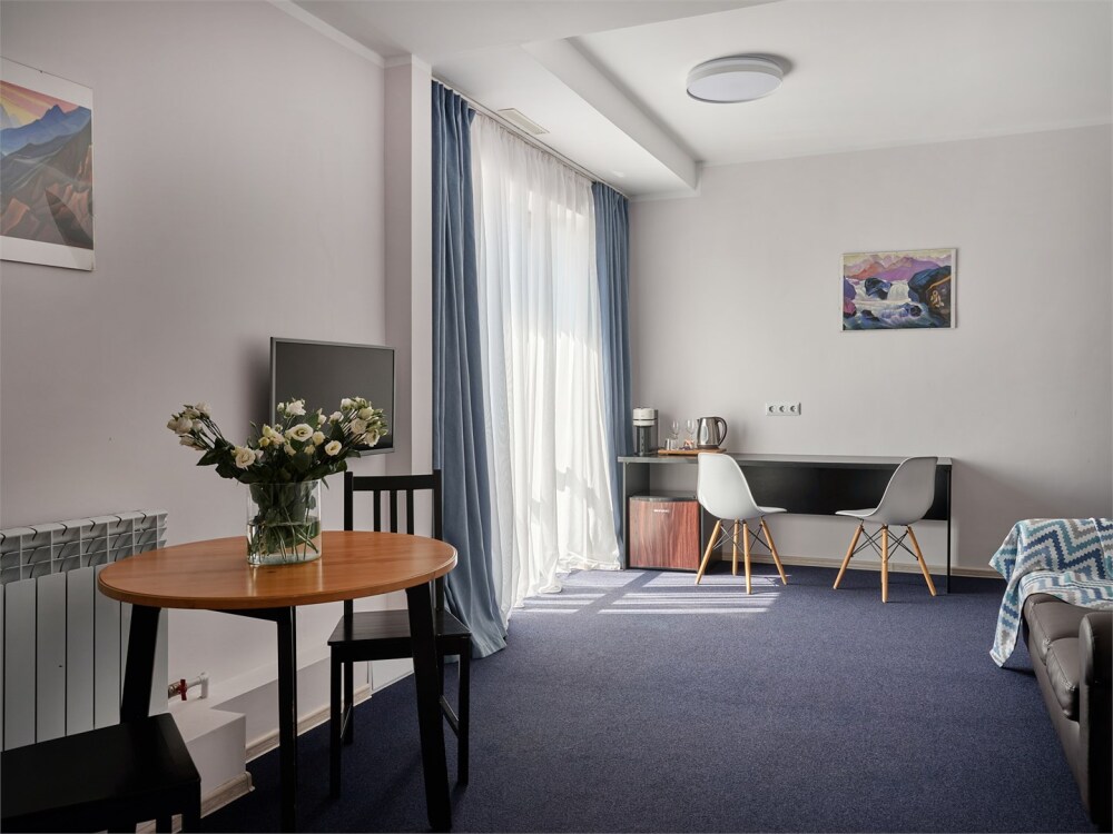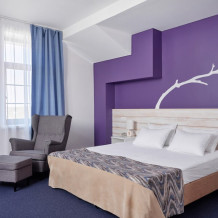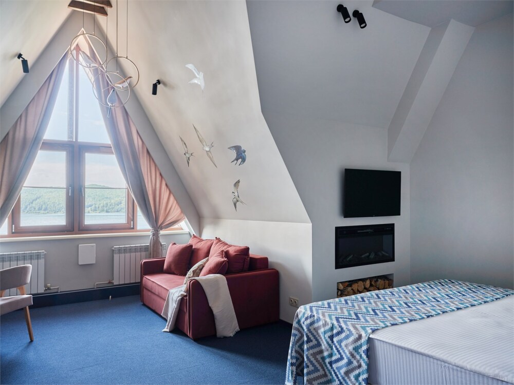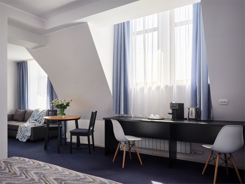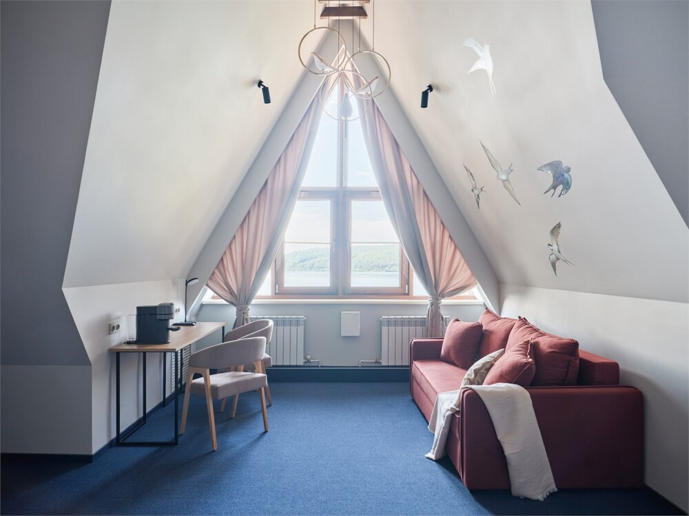 Просторный, изысканный номер с авторским дизайном, общей площадью 35 кв.м. Номера расположены на эксклюзивном этаже отеля, имеет одно большое окно с великолепным видом на Ангару.