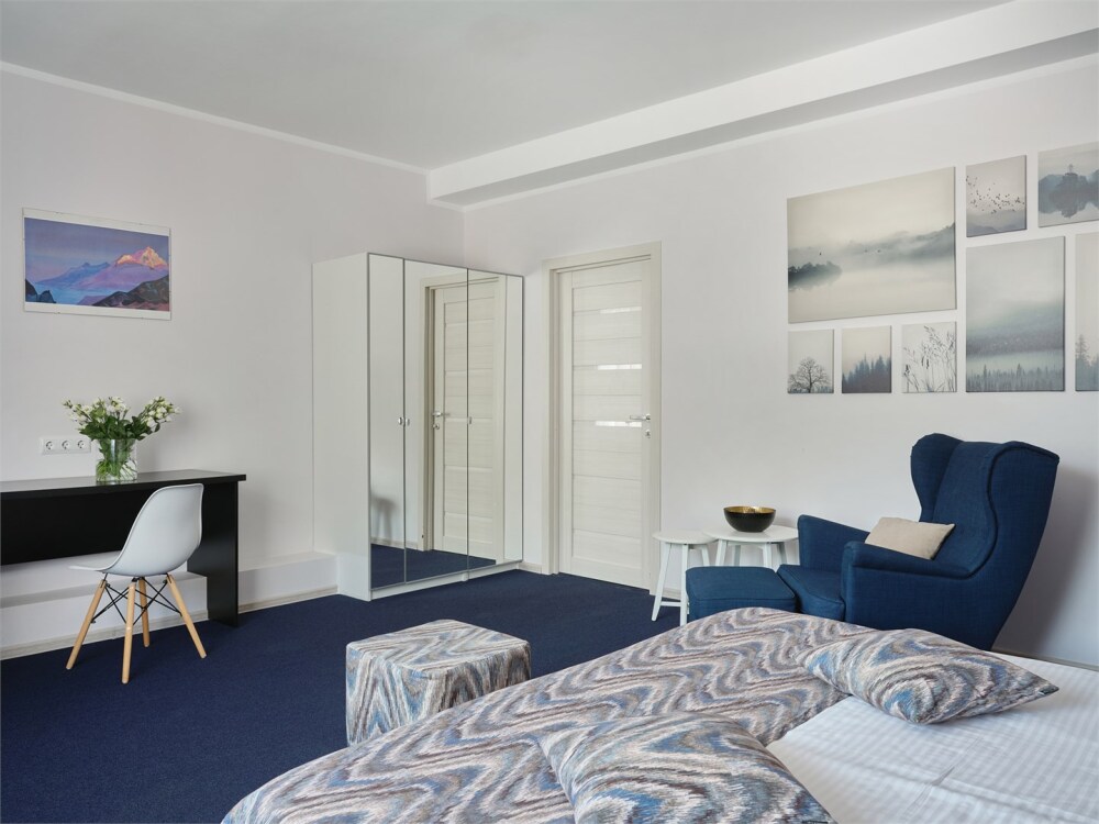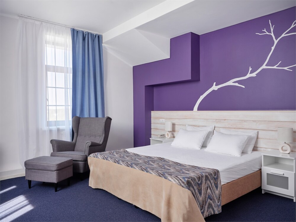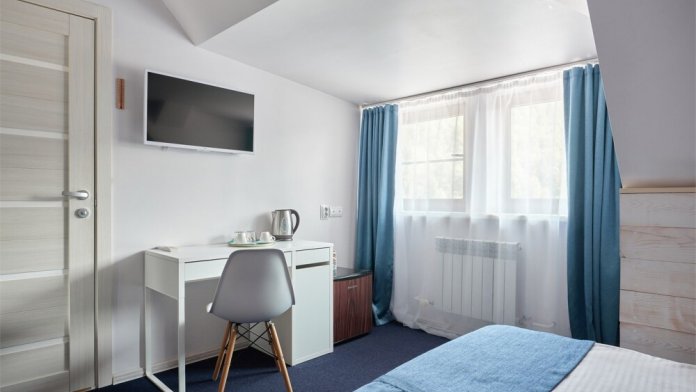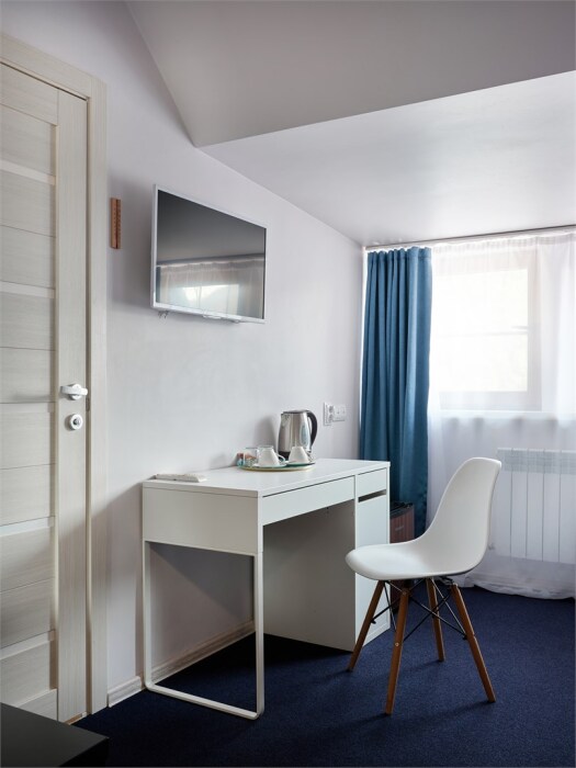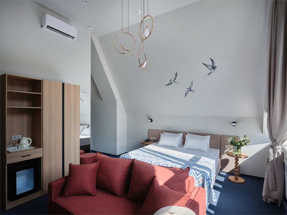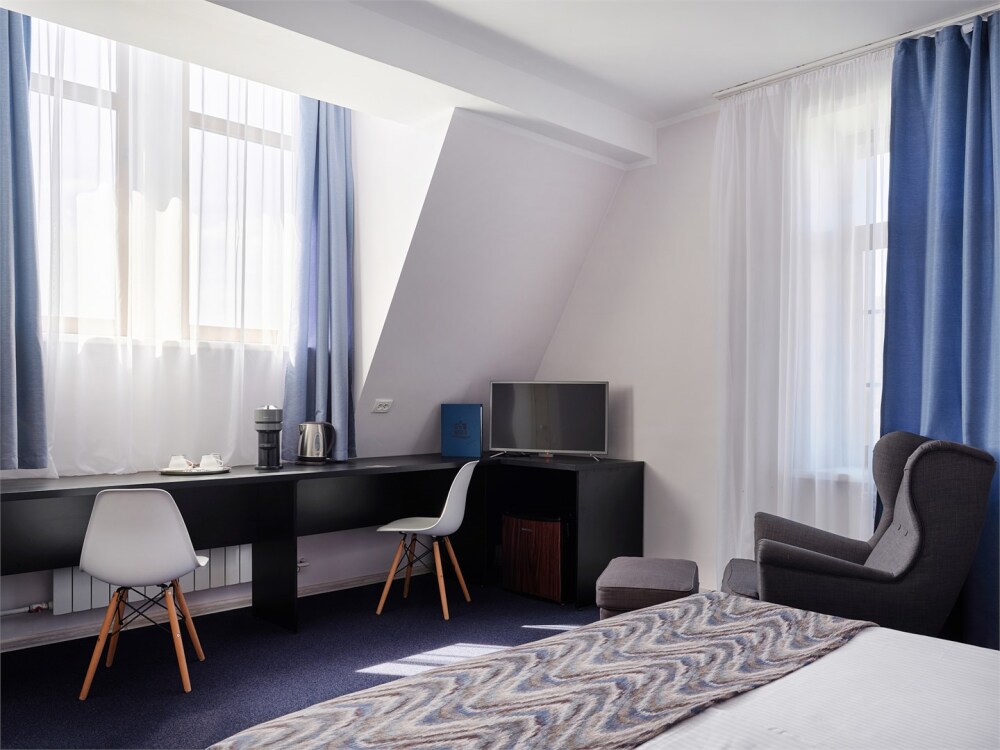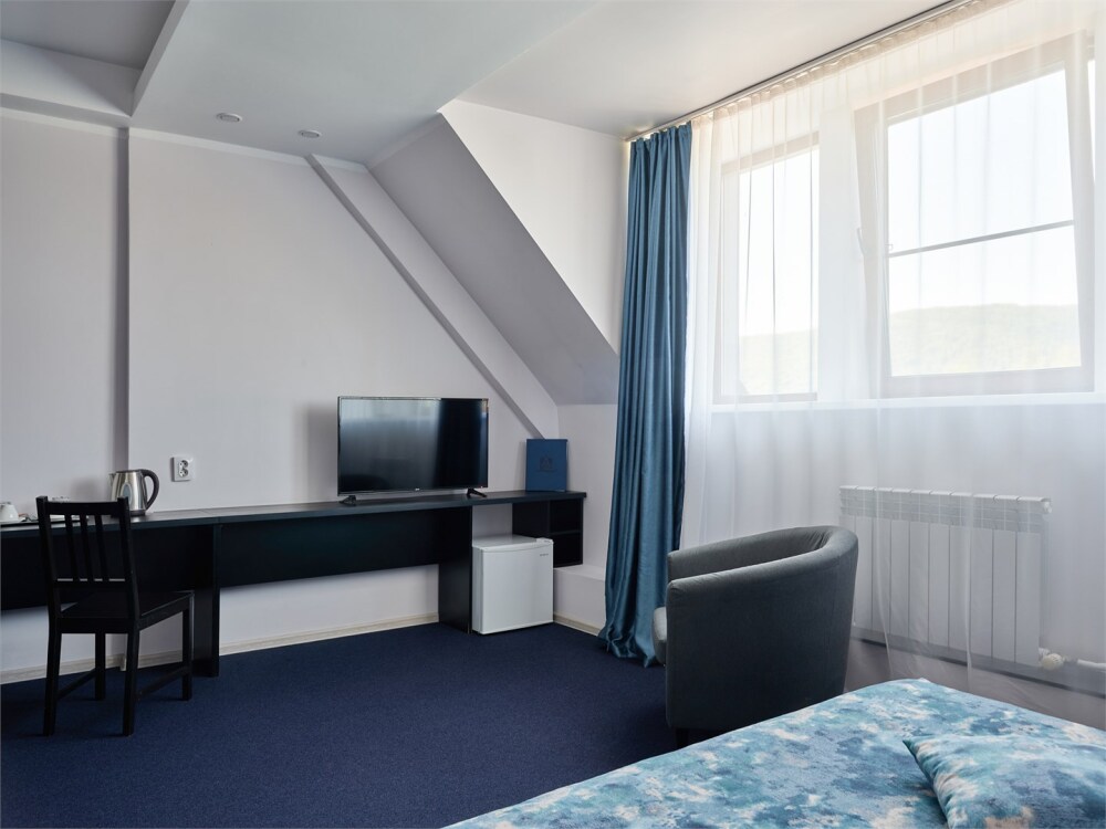 Просторный, яркий номер, укомплектован современной мебелью необходимой электронной техникой.