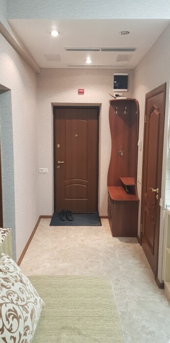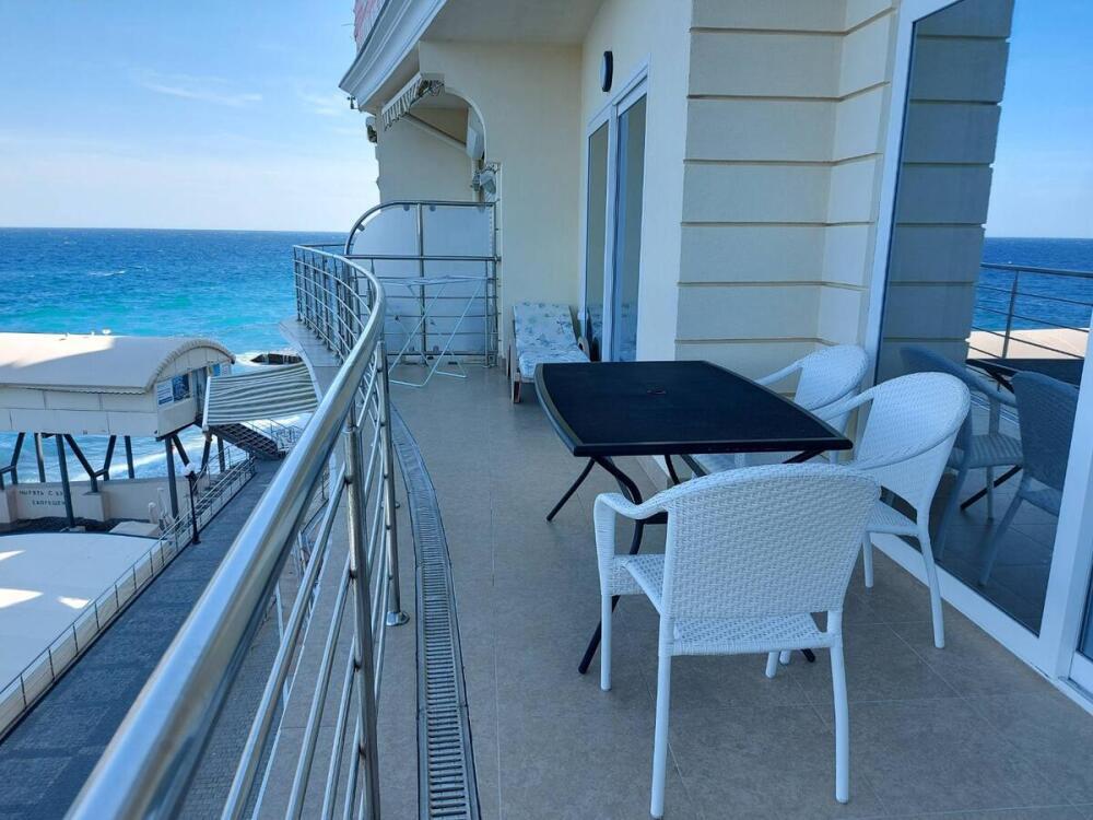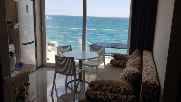 Апартаменты расположены на 3 этаже, рассчитаны на комфортный отдых 4 человек и укомплектованы всем необходимым. Представляют собой 4-местный номер в спа-отеле, а именно спальня (2 раскладных двуспальных дивана), совмещенная с кухней-гостиной с раскладным диваном. Полноценная кухня с посудой, холодильником и стиральной машиной. Санузел с душевой кабиной, панорамный балкон (со столом, стульями и лежаком) с видом на море, горы, Ялту.