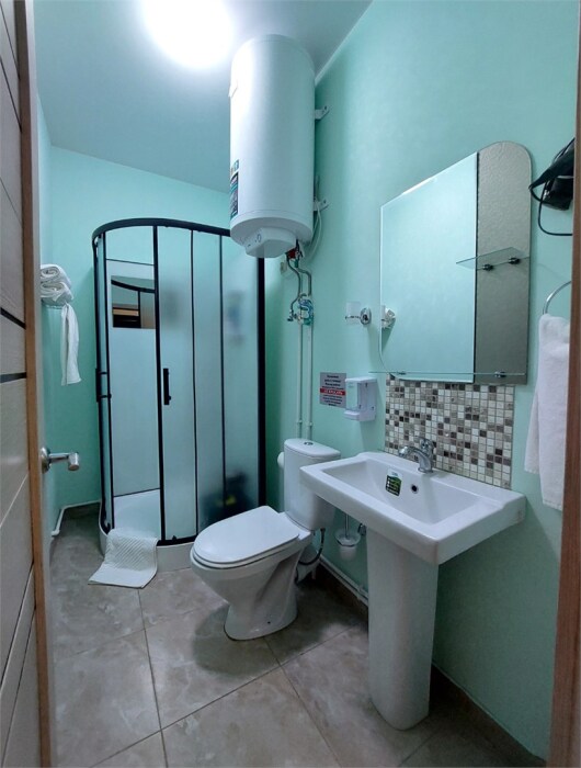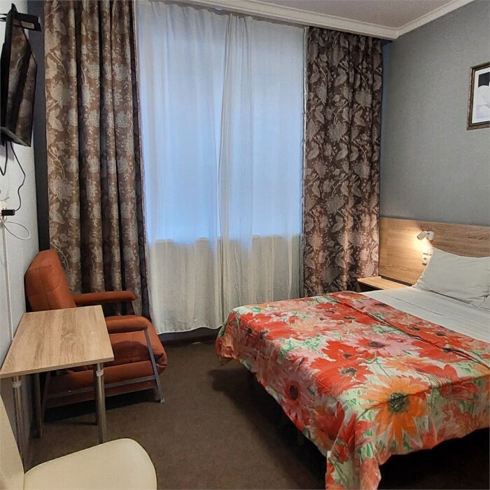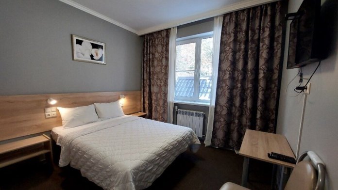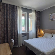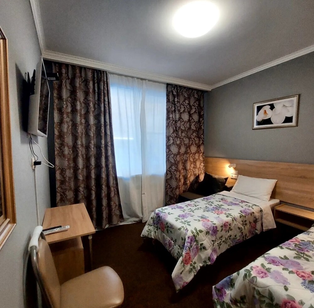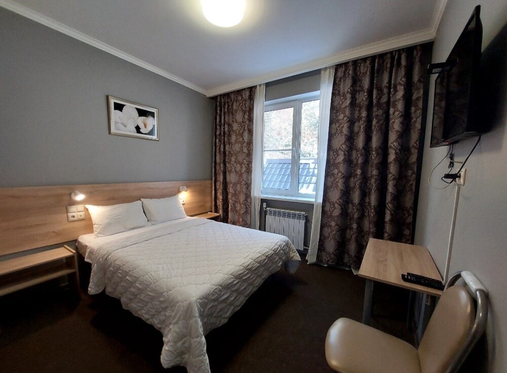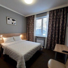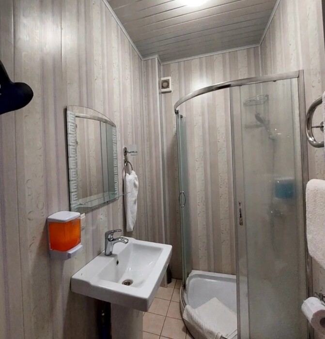 В номере: 2 односпальные или большая двуспальная кровать. Телевизор, небольшой столик, 2 прикроватные тумбочки, розетки возле кровати, белое постельное бельё. Туалетная комната: WC, раковина, душевая кабина, набор полотенец, инд. гигиенический набор (шампунь, гель для душа, шапочка для душа), фен, полотенцесушитель.