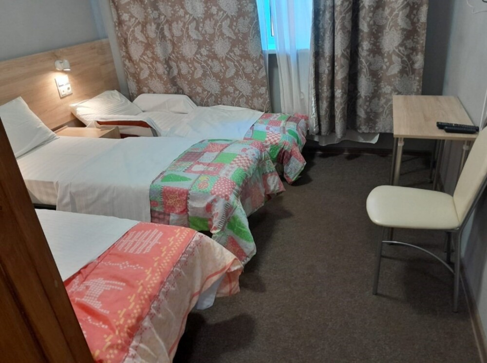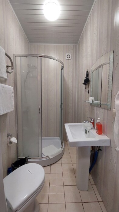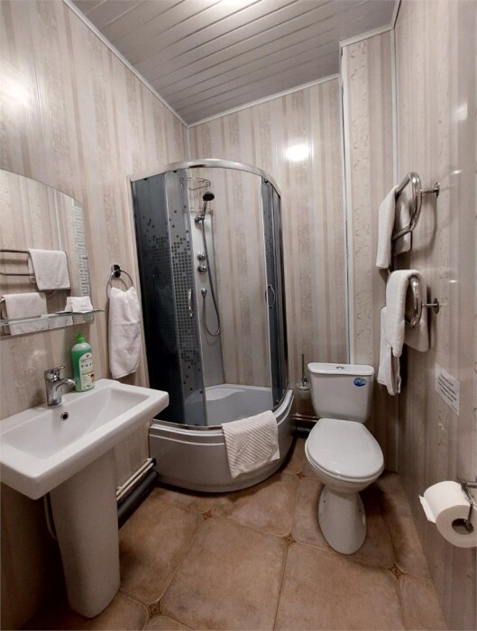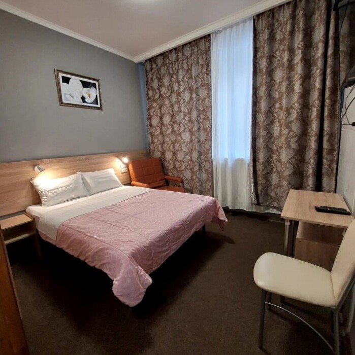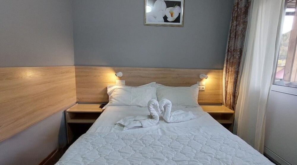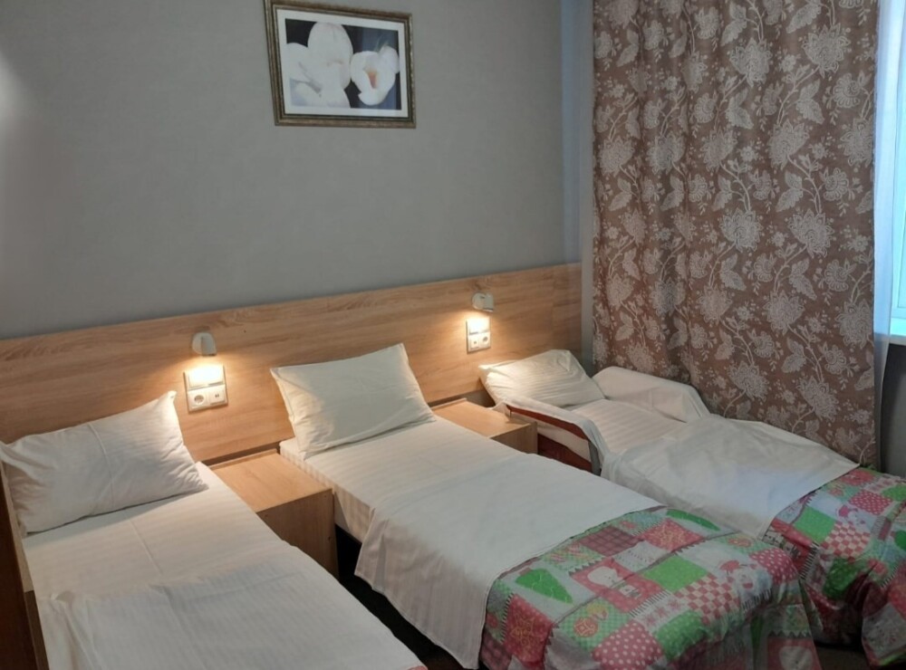 В номере: 2 односпальные или большая двуспальная кровать. Телевизор, небольшой столик, 2 прикроватные тумбочки, розетки возле кровати, белое постельное бельё. Туалетная комната: WC, раковина, душевая кабина, набор полотенец, инд. гигиенический набор (шампунь, гель для душа, шапочка для душа), фен, полотенцесушитель.