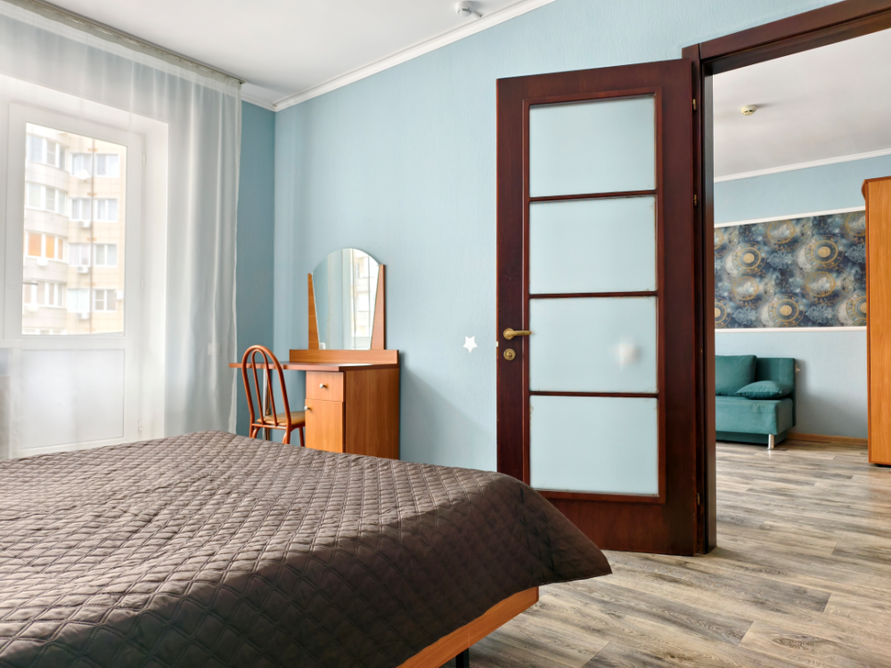 Первая комната: двуспальная кровать, прикроватные тумбочки, шкаф, туалетный столик, зеркало. Вторая комната: диван-кровать, журнальный столик, шкаф, стол, стулья, телевизор, кондиционер, мини-холодильник. Ванная комната: ванна, раковина, унитаз, зеркало, полотенцесушитель. Номер с балконом.